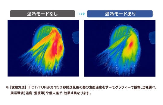 熱くなりすぎないように温風と冷風が一定間隔で切り替わる「温冷モード」を搭載しました。髪の表面温度を適温に保ち、過乾燥や髪への熱ダメージを抑えます。
