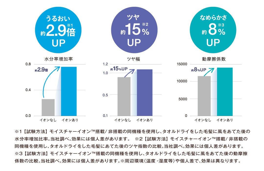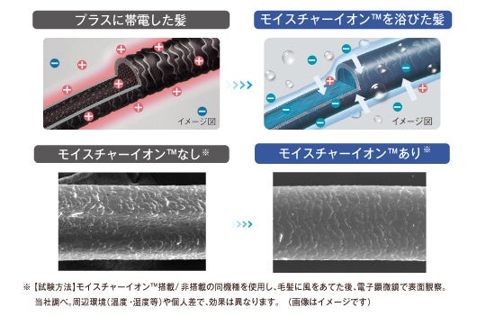 ヘアドライ時、髪の毛同士が触れ合う摩擦によって静電気が発生し、キューティクルがダメージを受ける原因となります。モイスチャーイオン™は、水分とマイナスイオンによって静電気を低減し、キューティクルを整えることで髪の毛にうるおいを与えます。モイスチャーイオン™によって、髪へのうるおい約2.9倍アップ、ツヤ約15%アップ、なめらかさ約8%アップ(※2)を実現しました。手触りから変化を実感できる、パサつかないみずみずしい髪へ導きます。