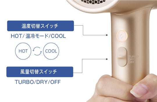 当製品に搭載されたモイスチャーイオン™は、水分とマイナスイオンをキューティクルに密着浸透させることで静電気を低減し、髪にしっとりとしたうるおいを与え、ツヤやなめらかさの向上に貢献します。またノズルが短く安定した重量バランスで持ちやすく、大風量1.5㎥/分(※1)のやさしく広がる風で髪をしっかりと乾かしながらも、温風と冷風が一定間隔で切り替わる「温冷モード」で過乾燥を防ぎ、髪への熱ダメージを抑制します。