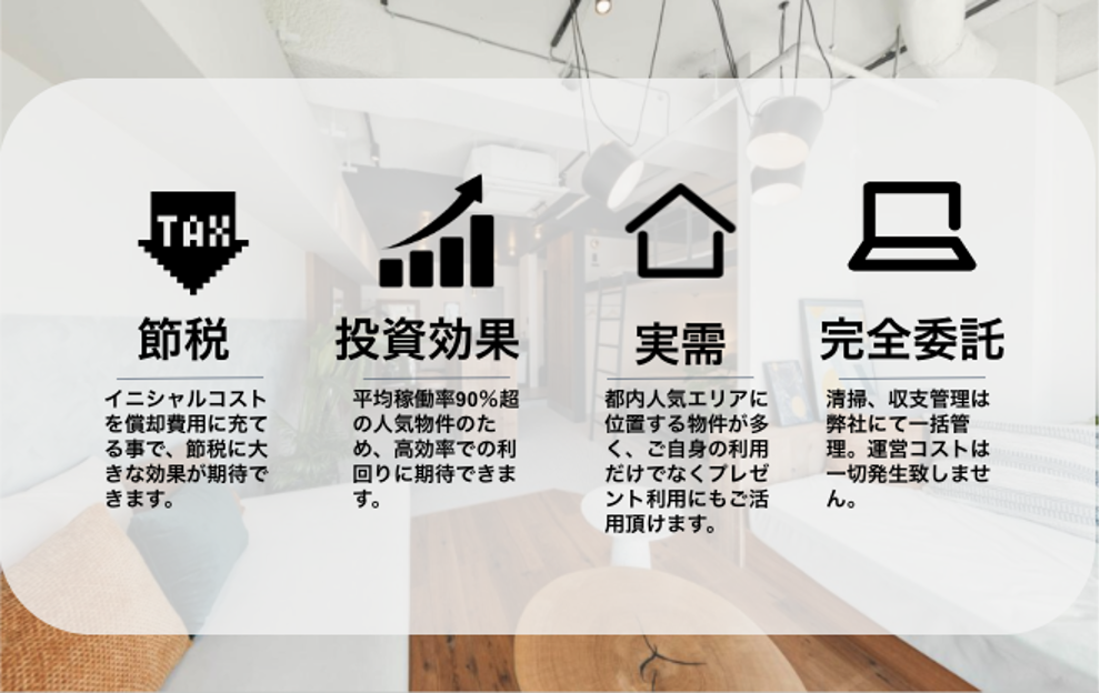 パートナー様にはイニシャルコストによる減価償却金額の計上による節税効果や宿泊料収入からのプロフィットシェア、またそれだけでなく、illi Staysを所有することで、ご自身、さらにはご家族でも宿泊利用することが実需として可能といった単なるキャッシュフローや収支を超えた付加価値を作り、これらを体験して頂けます。