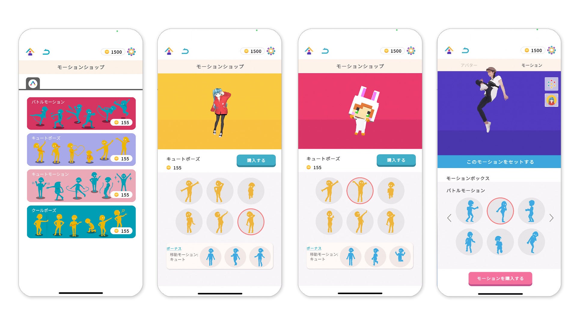 新しく追加できるモーションは、アプリ内に新設されるモーションショップから購入できるようになります。オープン時は、バトルモーション・キュートポーズ・キュートモーション・クールポーズの4種類のパックを選択可能です。ショップ内では、自分のアバターで動きを確認することもできます。