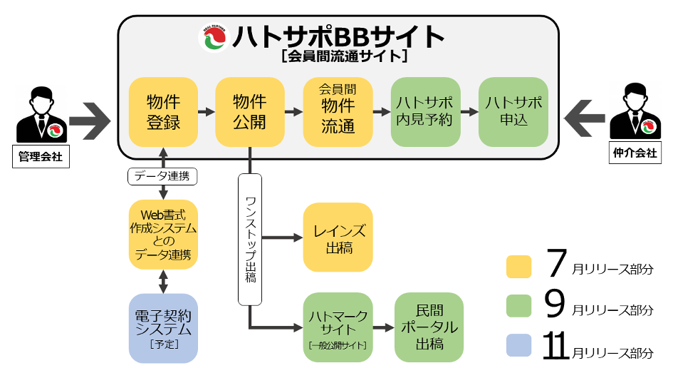 まず本年7月に、会員間流通機能を先行リリースし、続く9月に完全リリースする予定です。(「ハトサポBB全体概略図参照」)