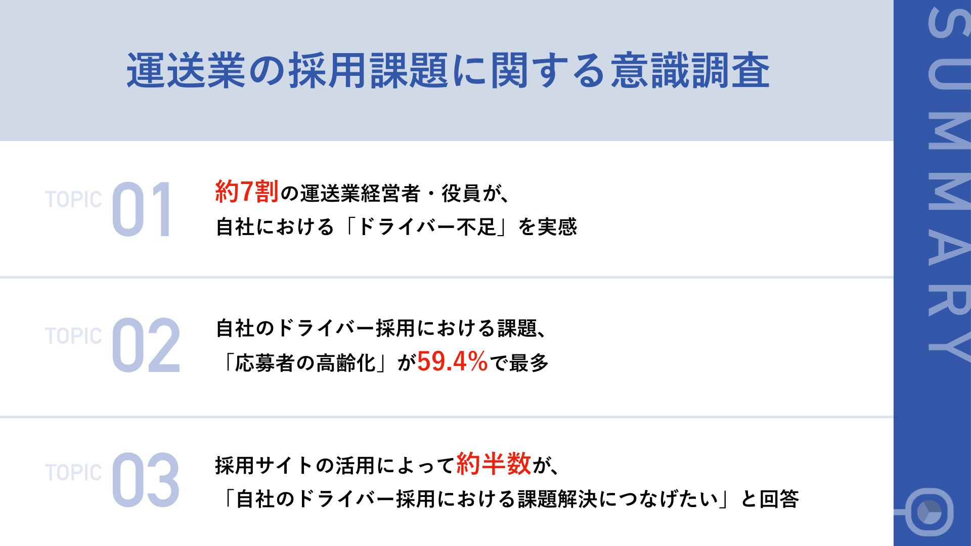 - 約7割の運送業経営者・役員が、自社における「ドライバー不足」を実感