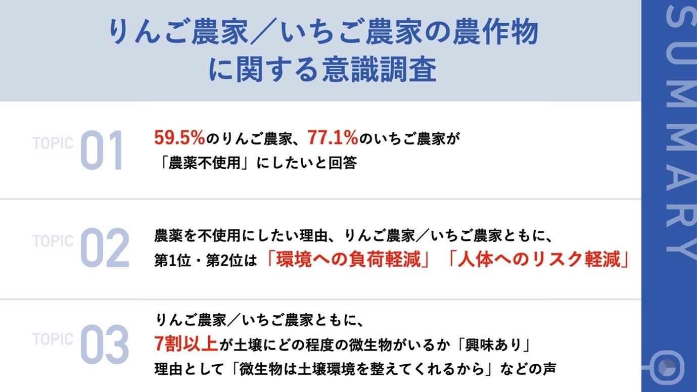 - 59.5%のりんご農家、77.1%のいちご農家が「農薬不使用にしたい」と回答