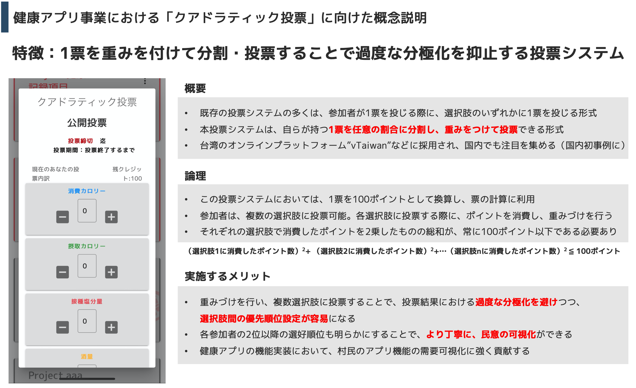 - 健康アプリ事業における「クアドラティック投票」に向けた概念説明