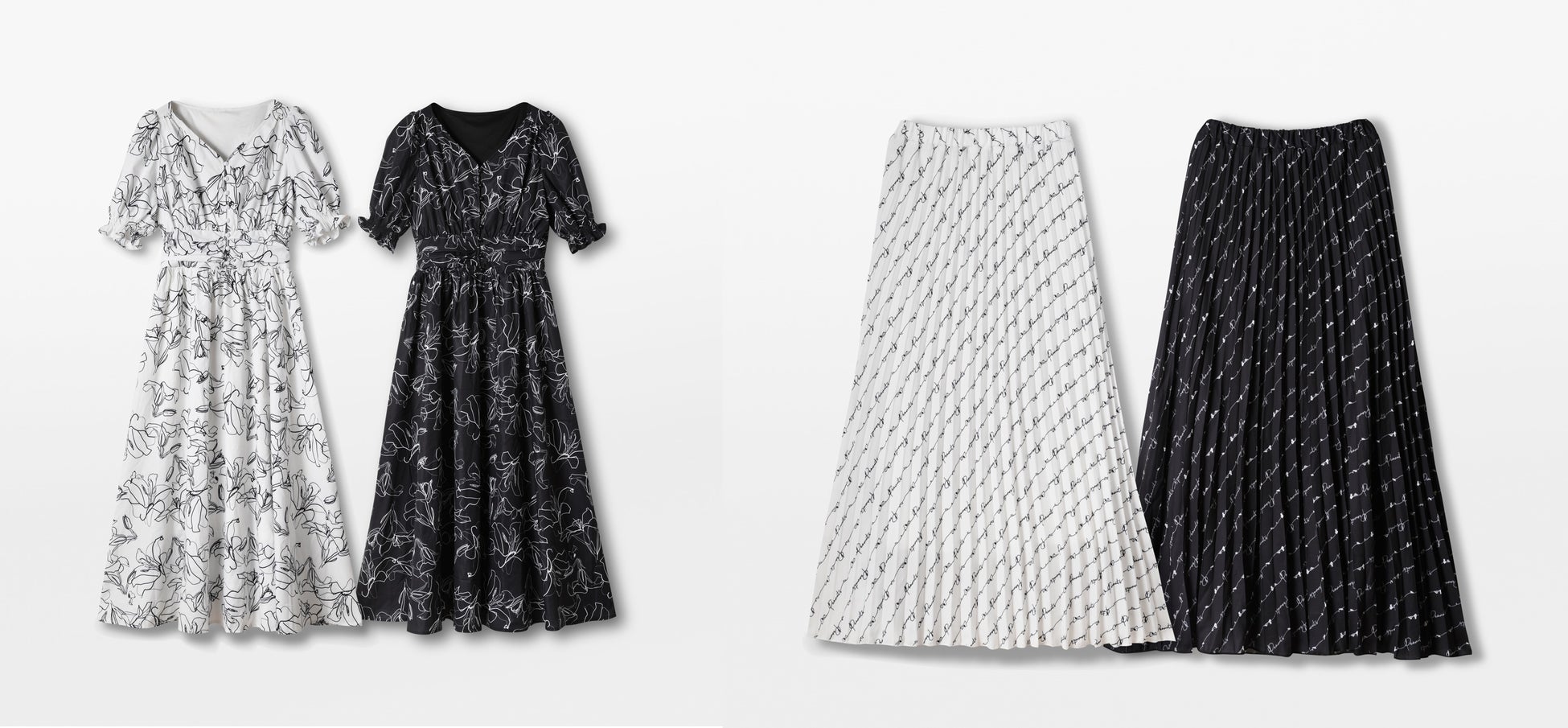 (左)総柄フレアワンピース 各9,790円 全2色 フリーサイズ(M~L対応)