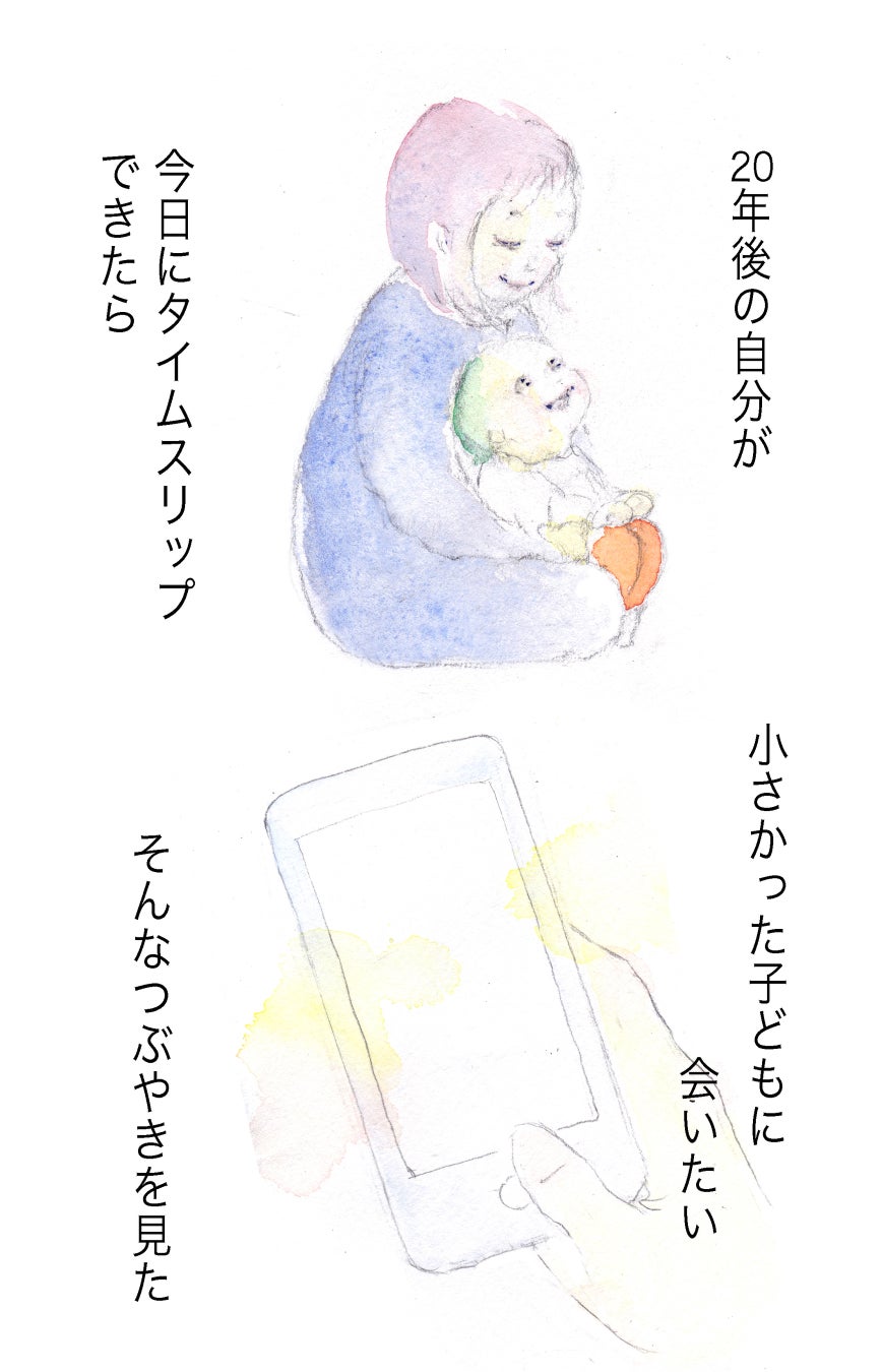 我が子と過ごす他愛ない一日の愛おしさを、未来の自分へ手紙を書いた自身の体験にのせて描いた本作品。