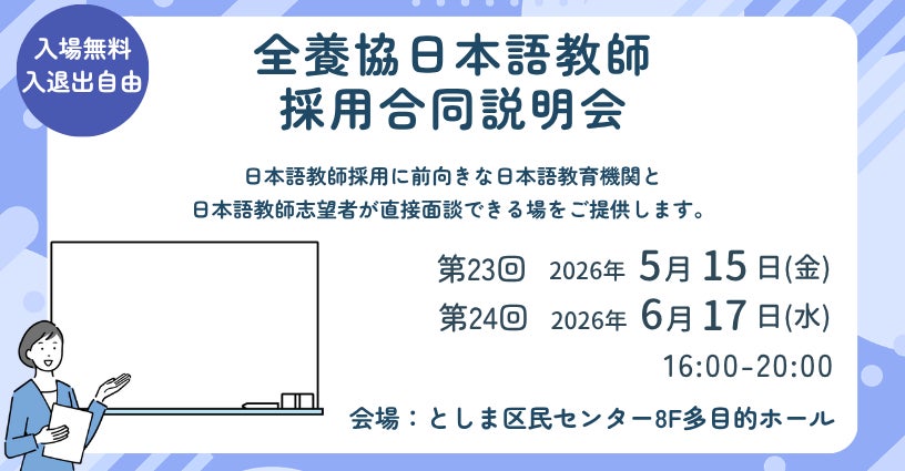 一般社団法人全国日本語教師養成協議会(全養協)は、2026年5月15日(金)に「第23回全養協日本語教師採用合同説明会」を、2026年6月17日(水)に「第24回全養協日本語教師採用合同説明会」を東京・池袋 にて開催いたします。