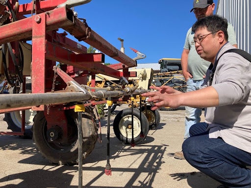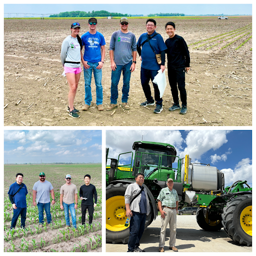 先立つ5月中旬、米国中西部のカンザス州の試験実施機関2社とネブラスカ州の試験実施機関1社を訪問、試験圃場の土壌の状態や耕作機械の状態を確認いたしました=下写真。1社は、試験で使われるトウモロコシの種を圃場に撒き終えており、すでに芽が出ていました。これからスキーポンを撒く予定の区画もあり、契約通り準備されていることが分かりました。