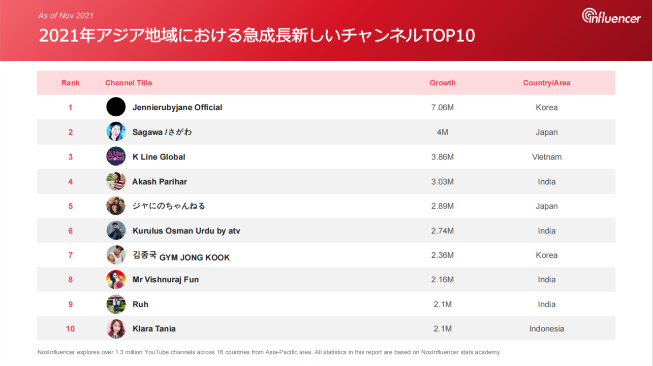 - 2021登録者数が最も急成長した新規チャンネルTOP10 日本のチャンネルがランクイン