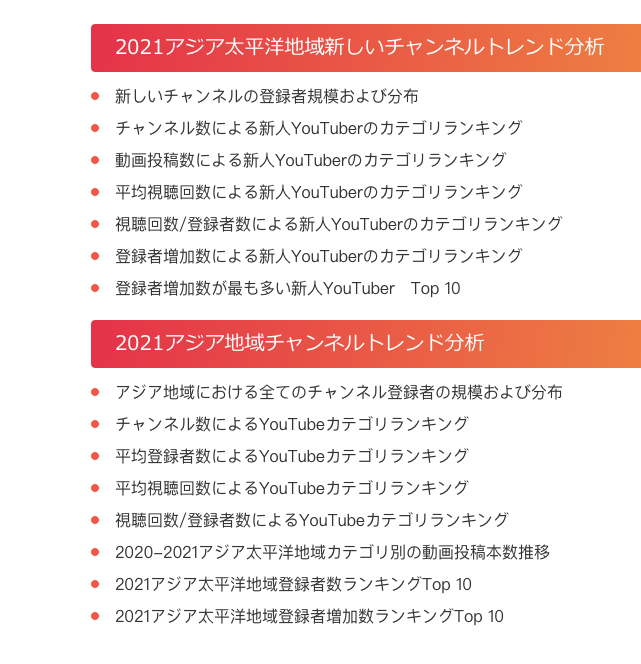 上記は新人YouTuberの一部のデータを示し、すべてのチャンネルのデータを確認するには、下のリンクをクリックしてレポートをダウンロードしてください。