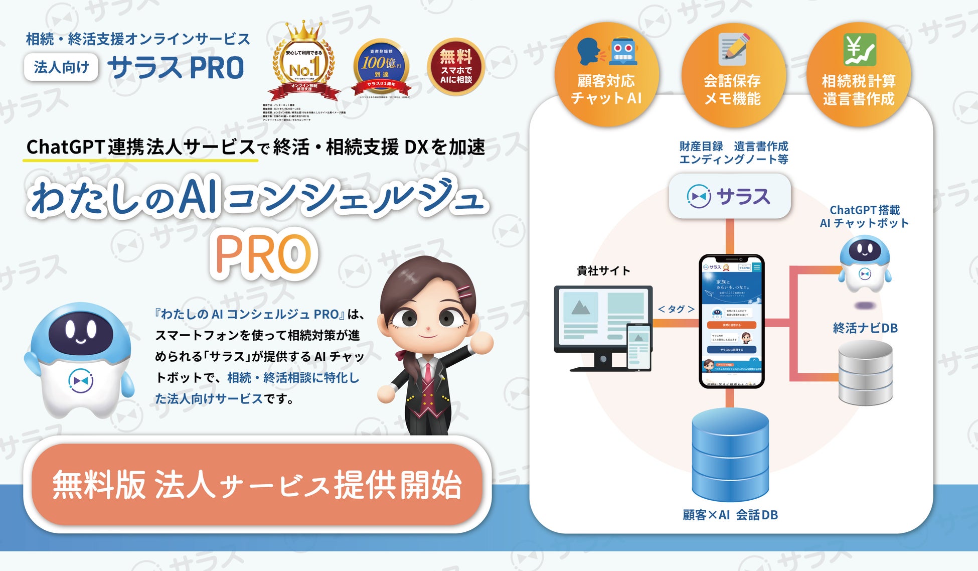【法人向け】ChatGPT連携の相続・終活支援AIチャットボット『わたしのAIコンシェルジュPRO』を提供開始
