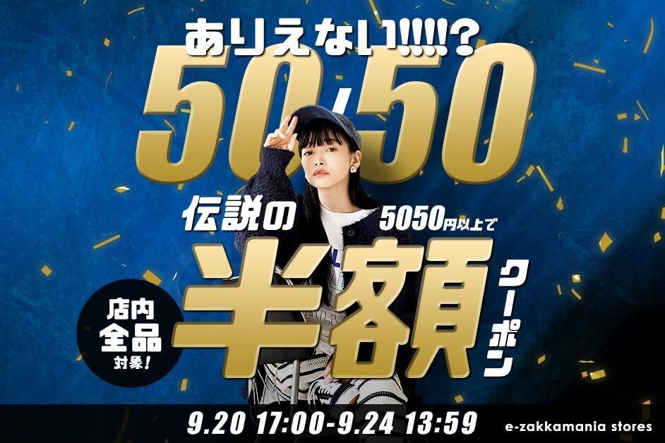 レディースアパレルを中心としたECサイト「イーザッカマニアストアーズ」などを運営している有限会社ズーティー(本社:兵庫県神戸市、代表取締役:今石 雄介)は、イーザッカマニアストアーズ楽天市場店にて、5050円以上で店内全品半額になる『伝説は止まらないッ!5050円以上で店内全品半額!!』クーポンを2024/9/20 17:00~緊急イベントを開催します。