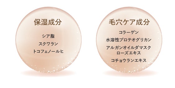 乾燥や紫外線など、厳しい肌環境から肌の潤いを守るシアオイルやスクワランなど3種類の保湿成分と、ハリのある印象に導くコラーゲンや水溶性プロテオグリカンなど5種類の自然由来美容成分を配合しました。