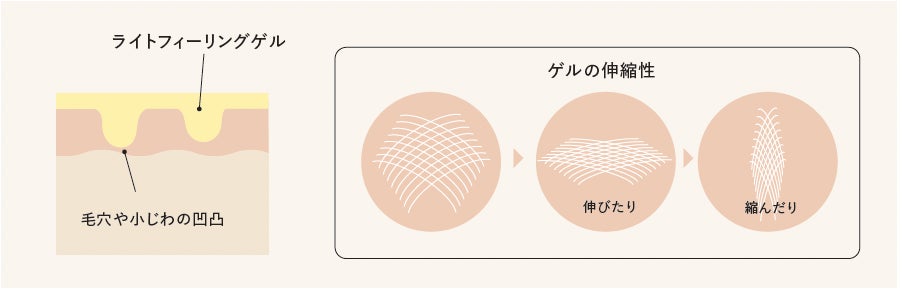 三次元構造を持ち、伸縮性に優れたライトフィーリングゲルを独自に配合。肌の凹凸にあわせて隙間なくフィットするので、つるんとなめらか、毛穴や小ジワの目立たない仕上がりに。