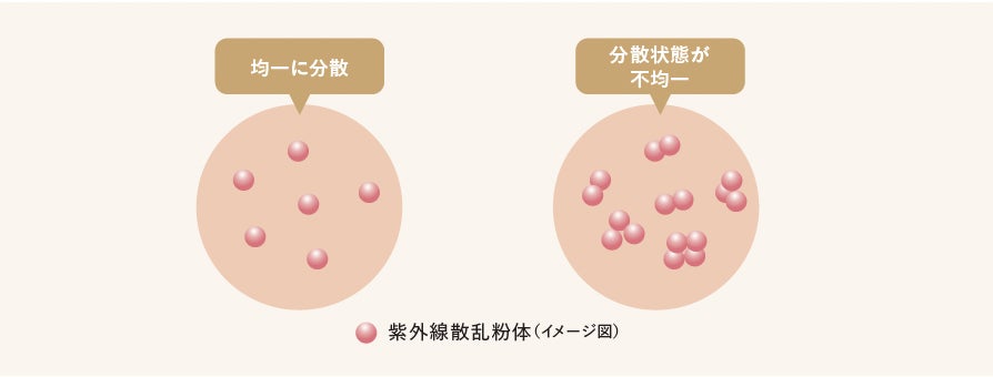 紫外線散乱剤を均一に分散させることで重さを感じさせずに高いSPF値を実現。同時に粉体量を抑えることで、のびの良さやなめらかなつけ心地を叶えました。