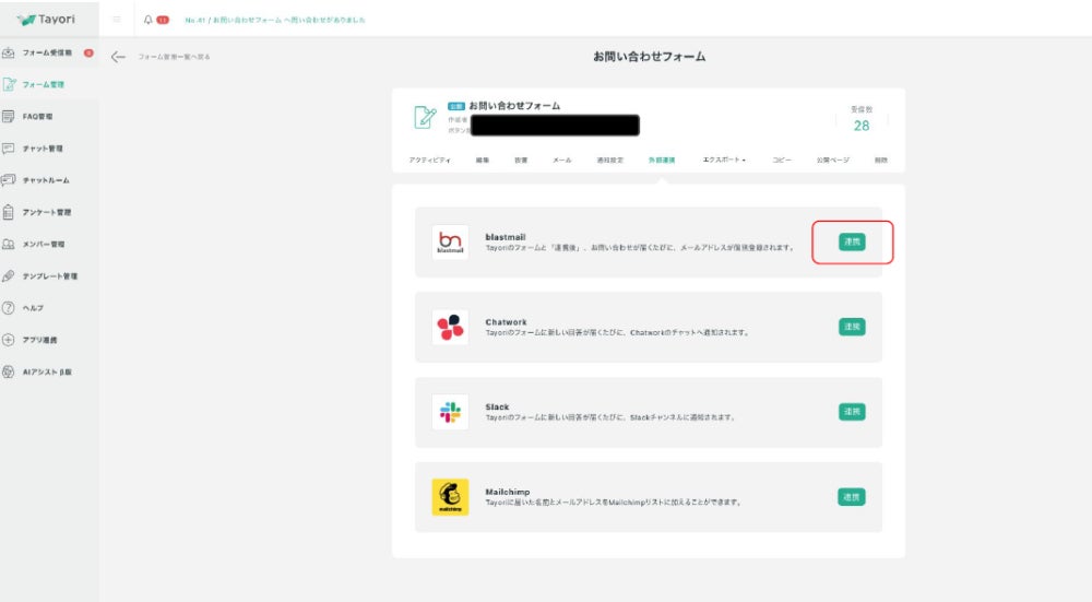 Tayoriの管理画面のフォーム管理より指定のフォーム「外部連携」タブから設定が可能です。具体的な設定方法