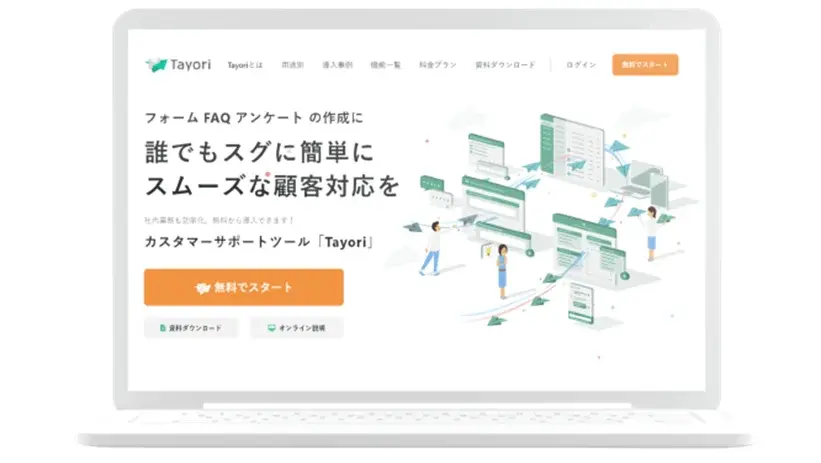 「Tayori」は、少人数でも最適な顧客体験を提供するカスタマーサポートツールです。「フォーム」「FAQ」「チャット」「アンケート」4つの基本的な機能をノーコードで専門知識無く作成・運用できます。