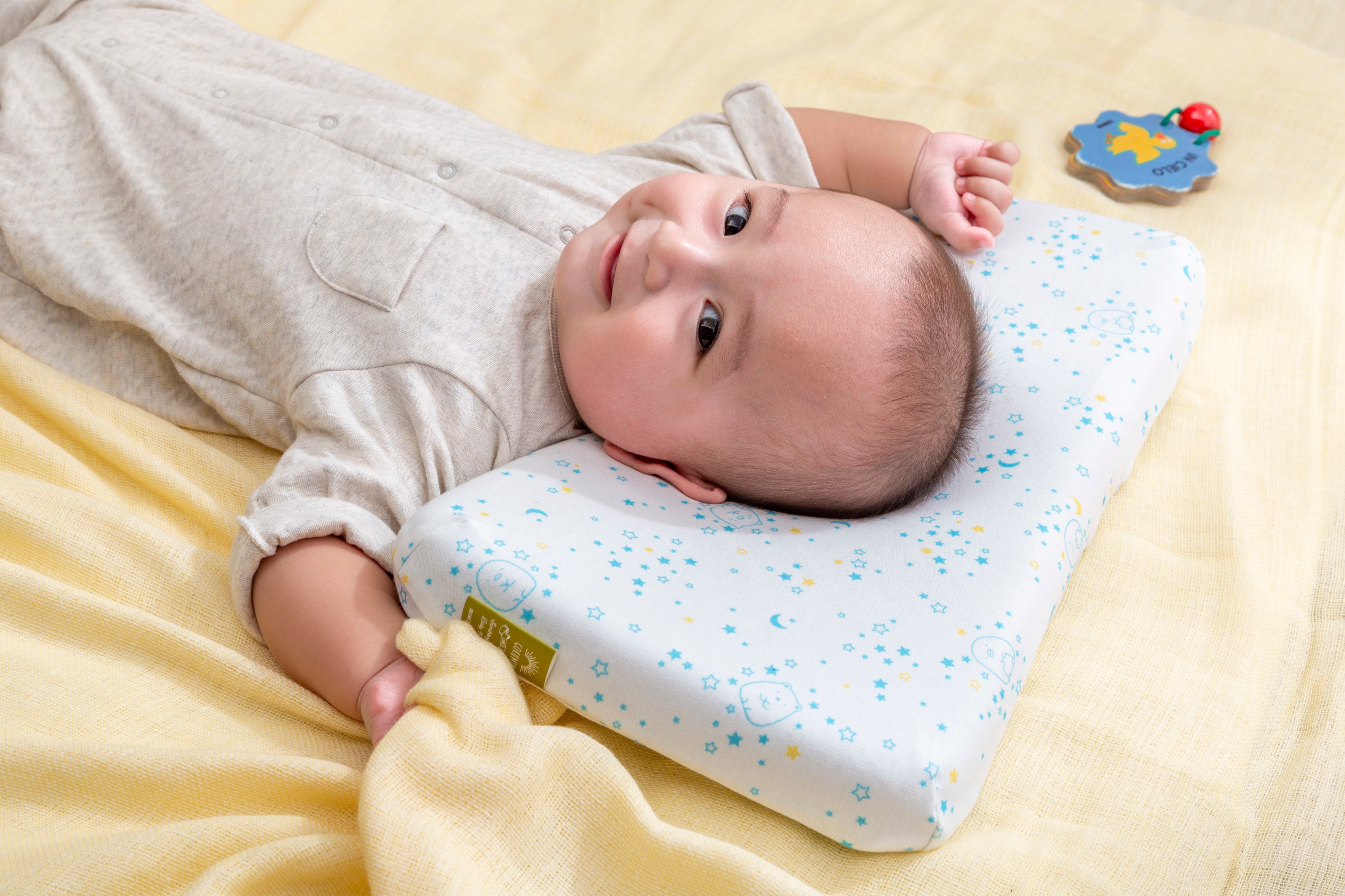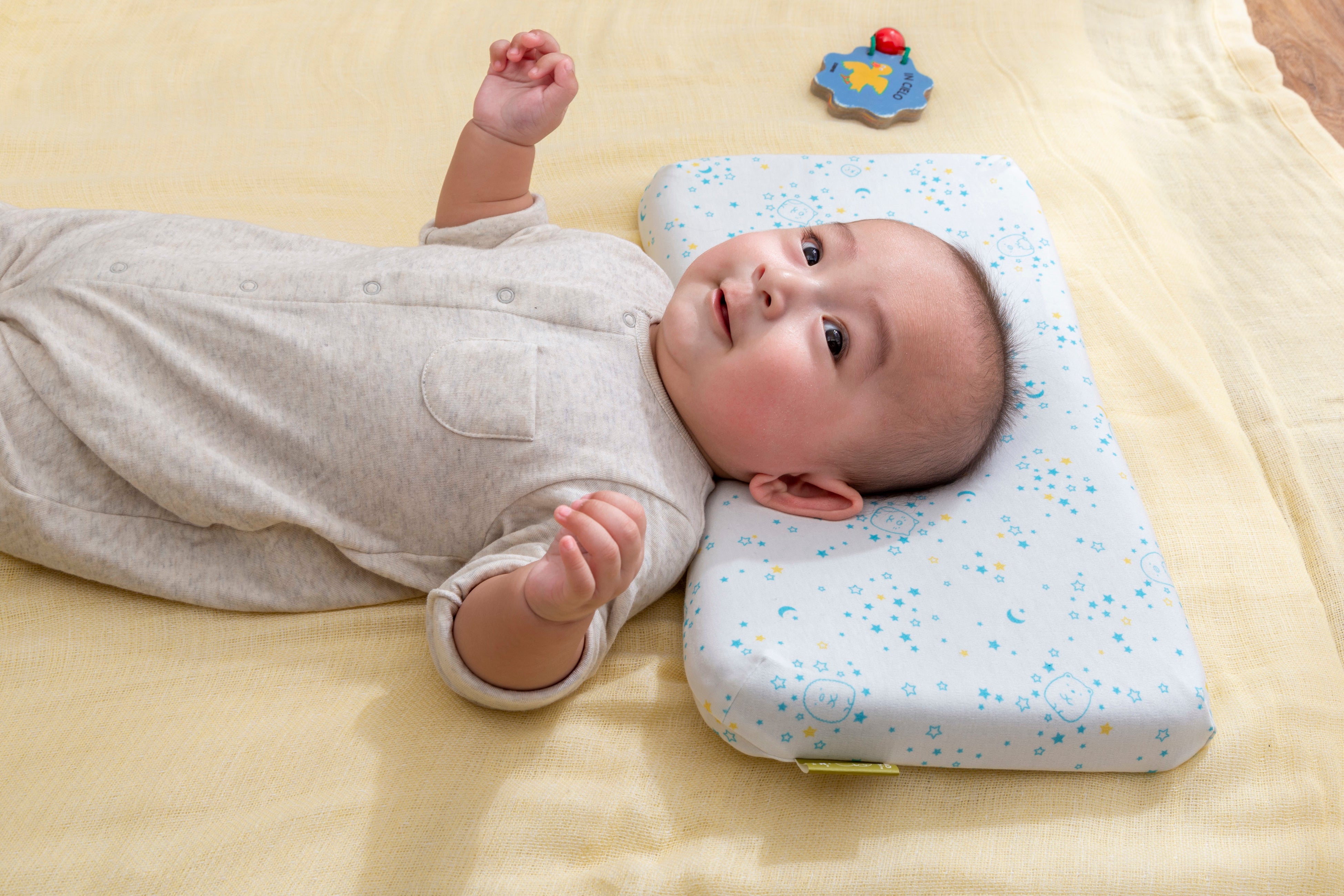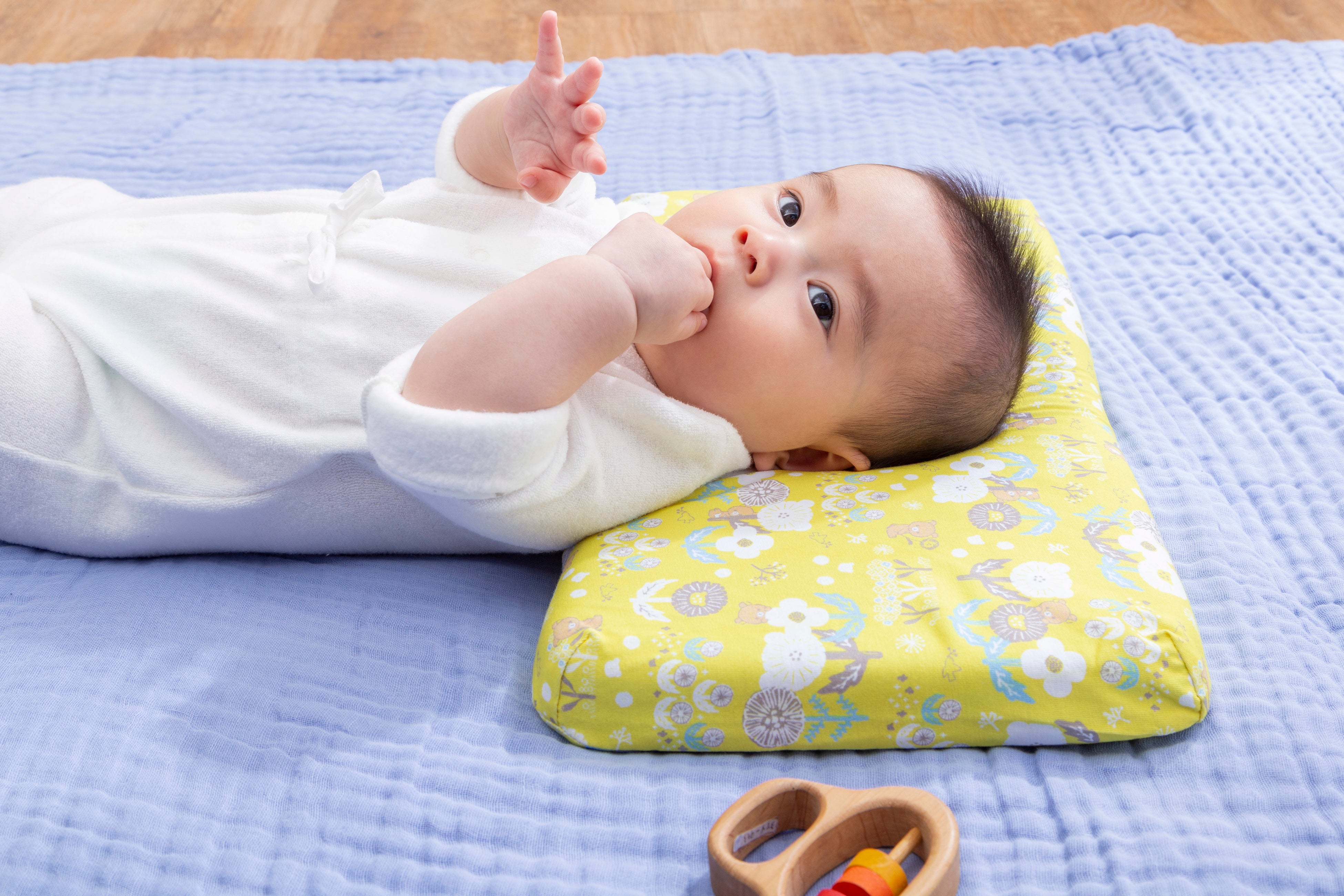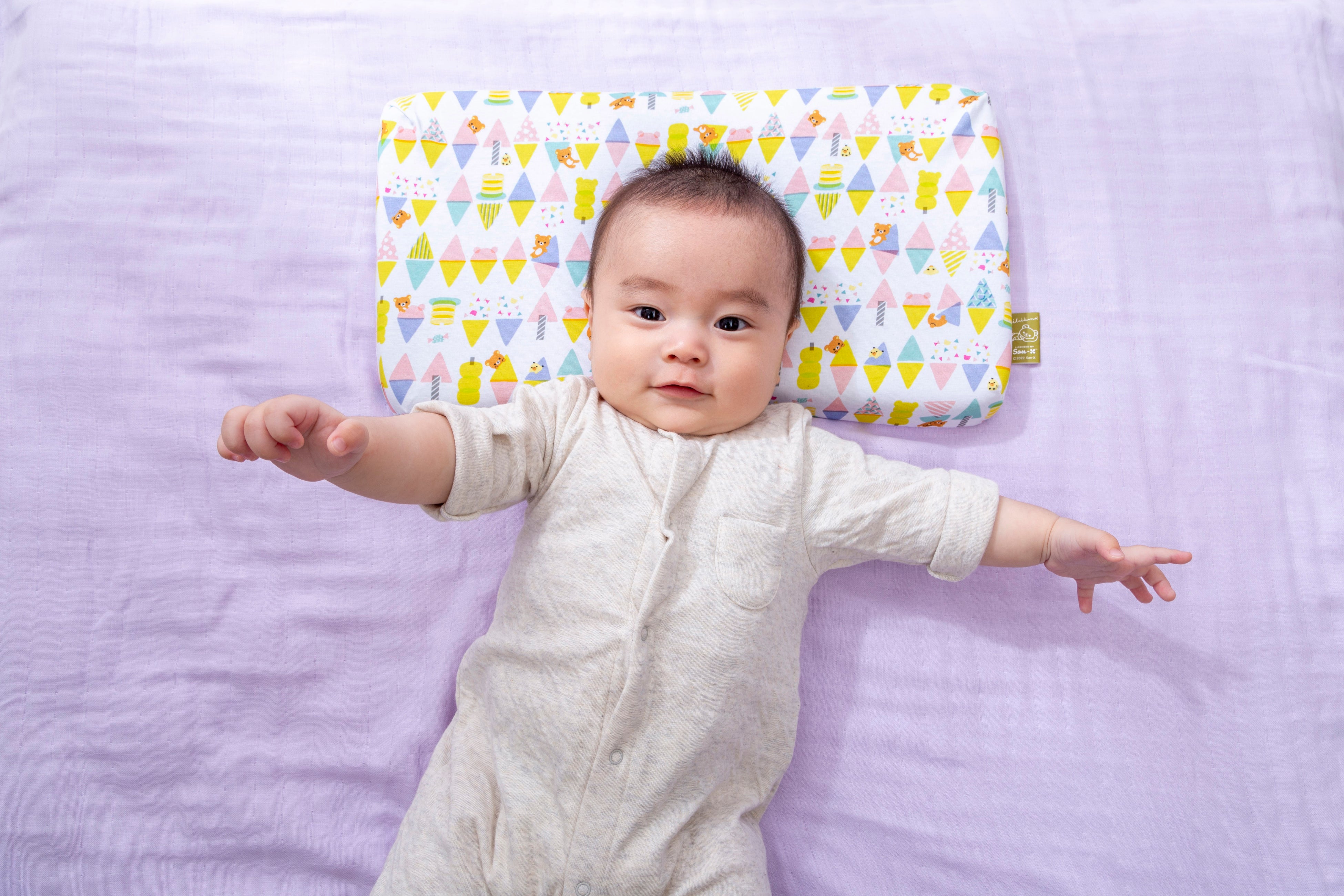 1.人間工学に基づいた形状で、赤ちゃんの首・頸椎をやさしくサポート。中央の丸いくぼみは、360°丸い曲面で赤ちゃんの頭にやさしく包み込むようにフィットし、絶壁や向き癖を防止します。赤ちゃんが動いても枕から落ちてしまわないよう、枕自体もずれにくく安定するように、横幅は大きめに設計しました。