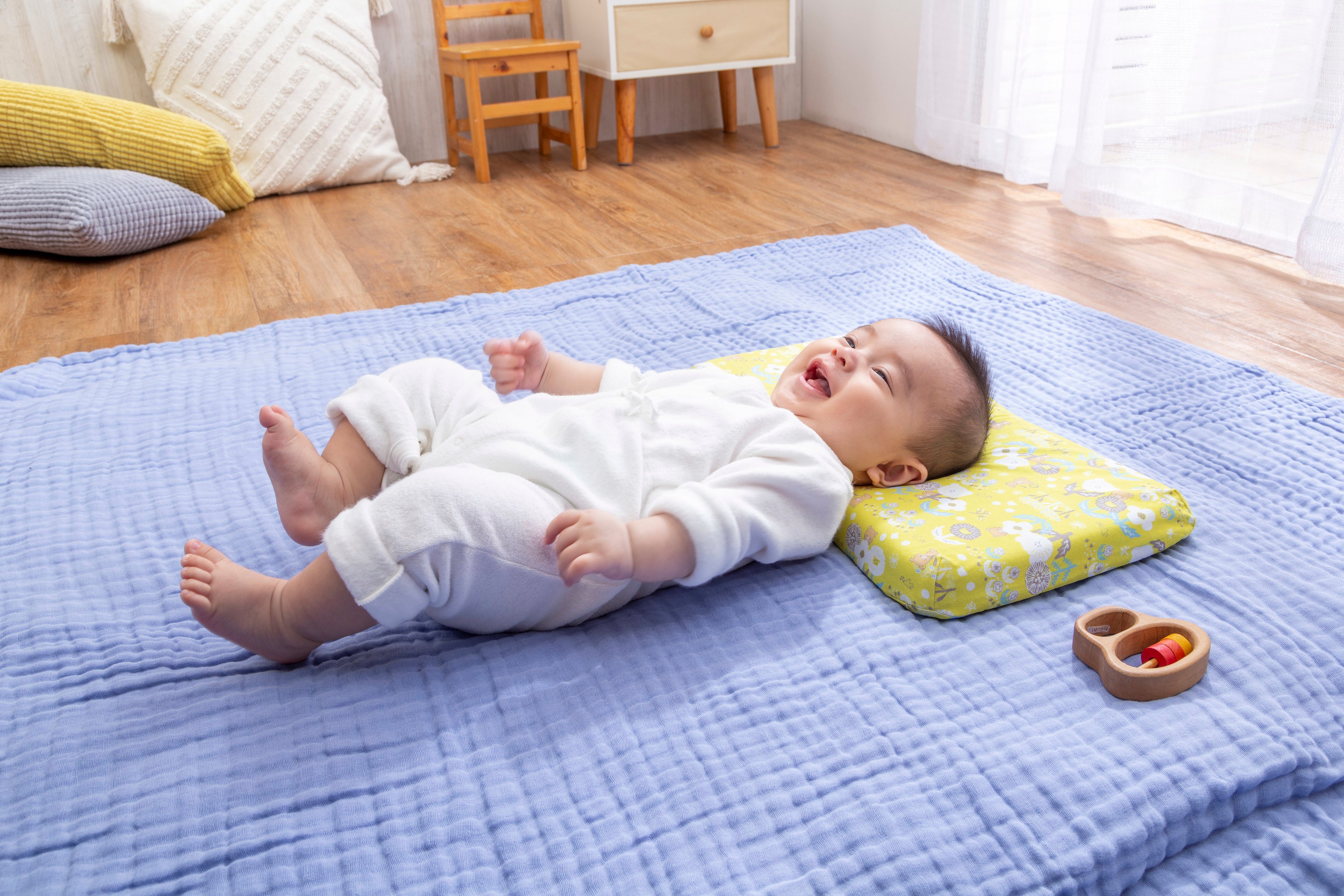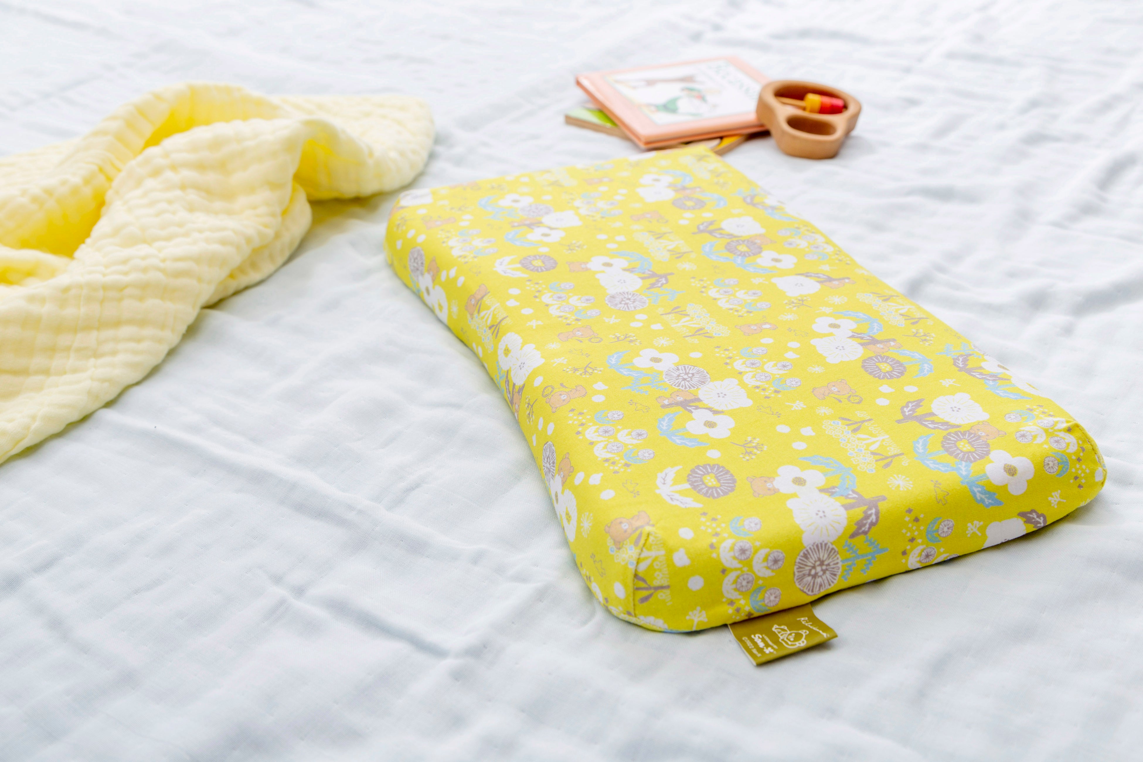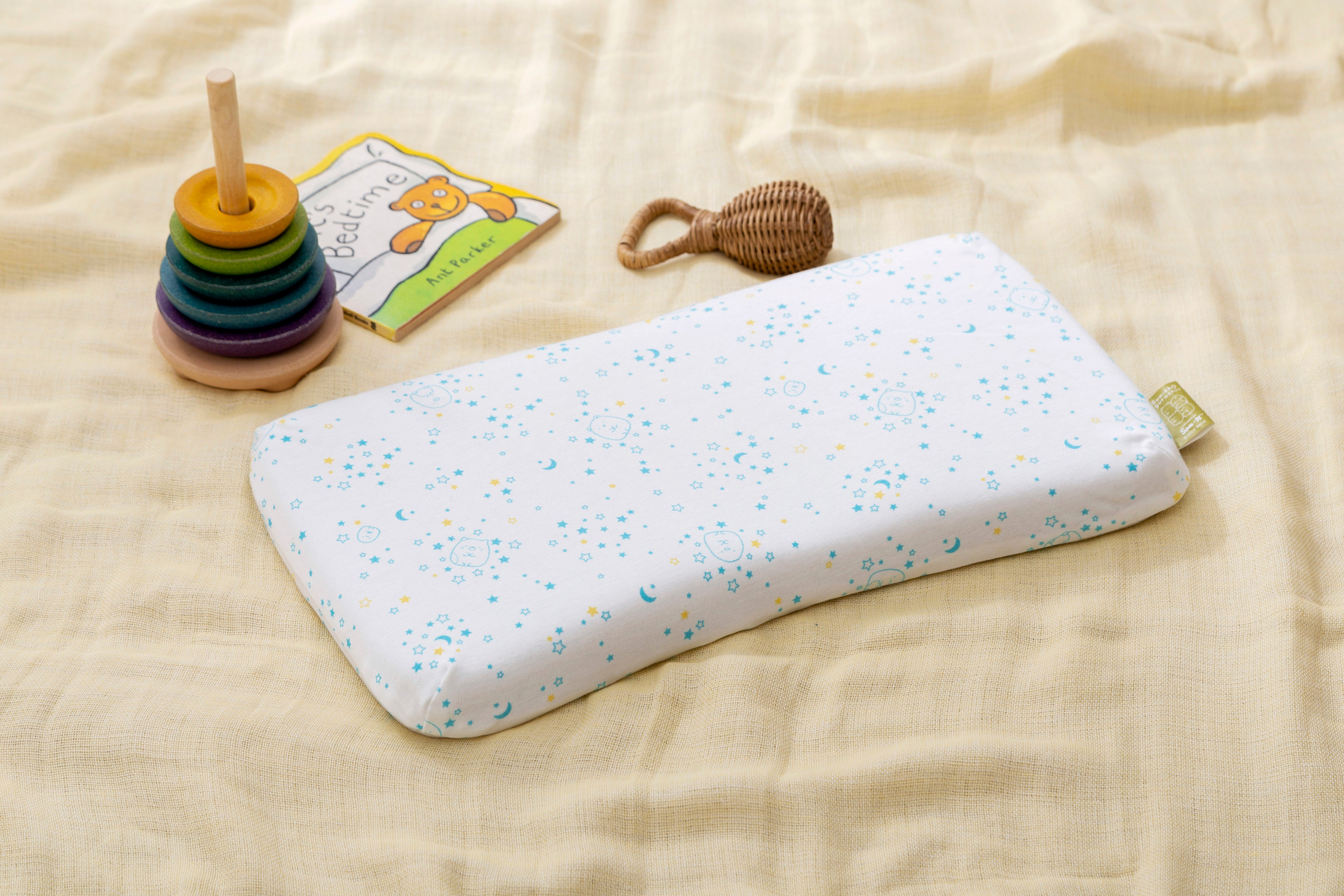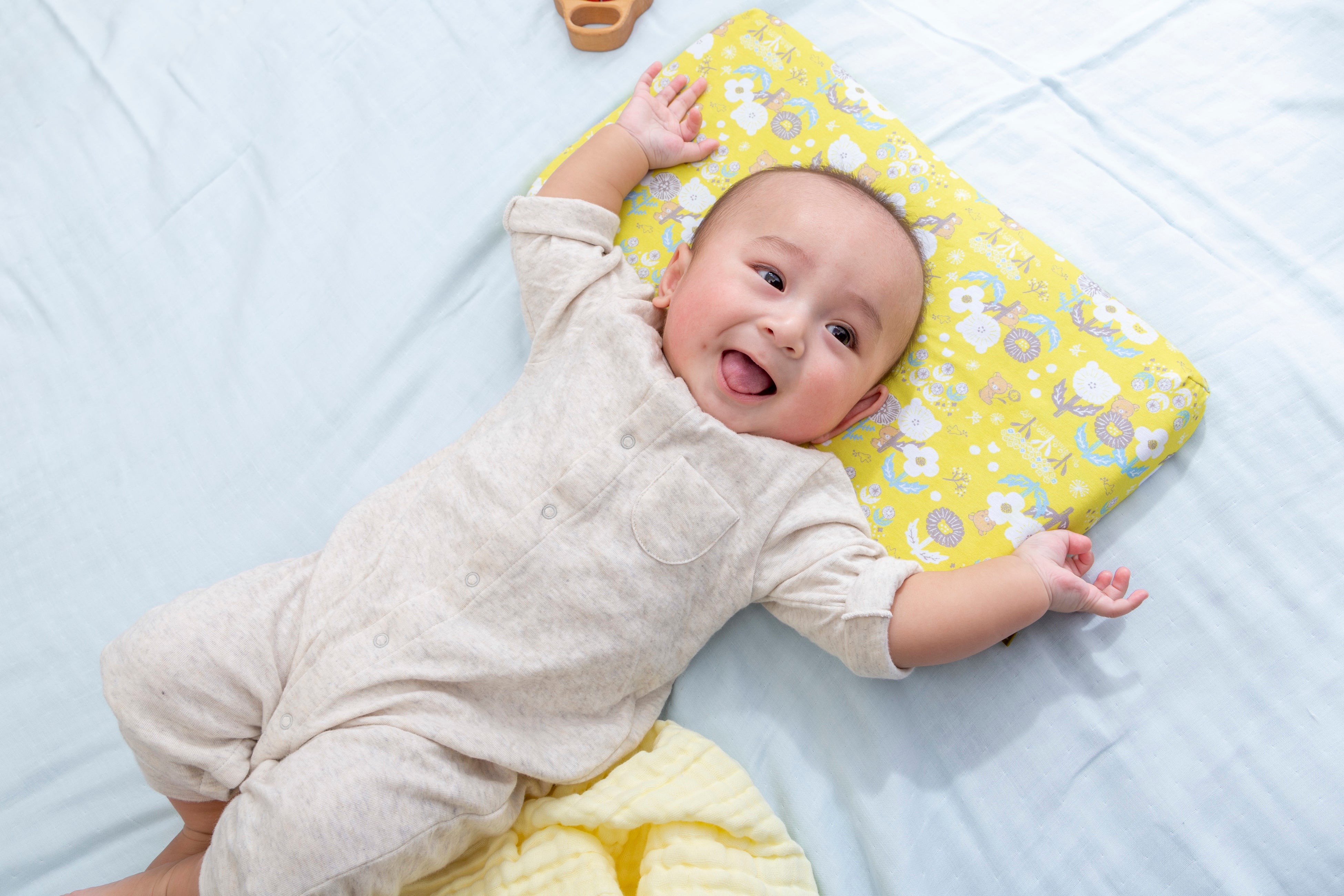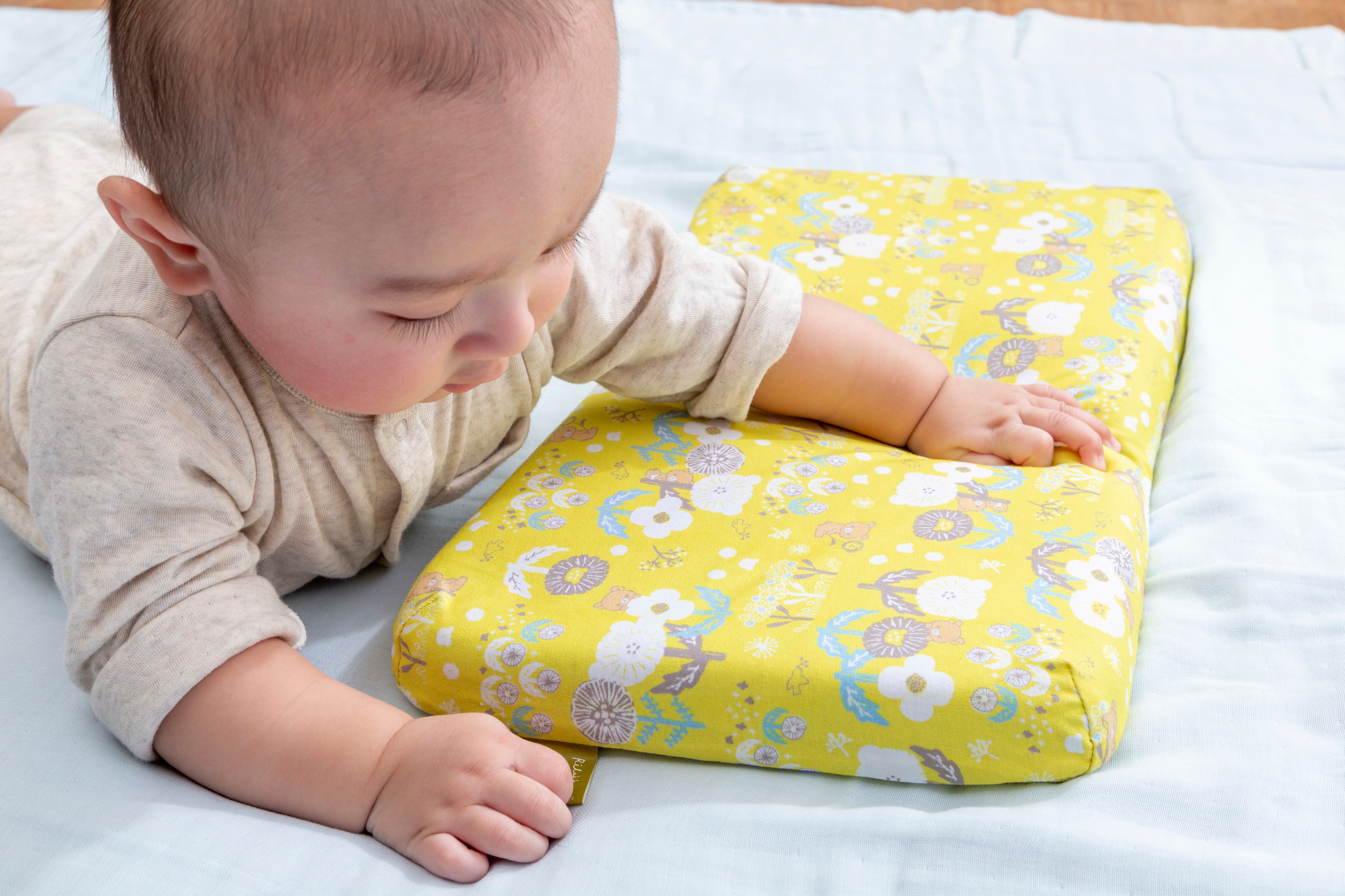 1.人間工学に基づいた形状で、赤ちゃんの首・頸椎をやさしくサポート。中央の丸いくぼみは、360°丸い曲面で赤ちゃんの頭にやさしく包み込むようにフィットし、絶壁や向き癖を防止します。赤ちゃんが動いても枕から落ちてしまわないよう、枕自体もずれにくく安定するように、横幅は大きめに設計しました。