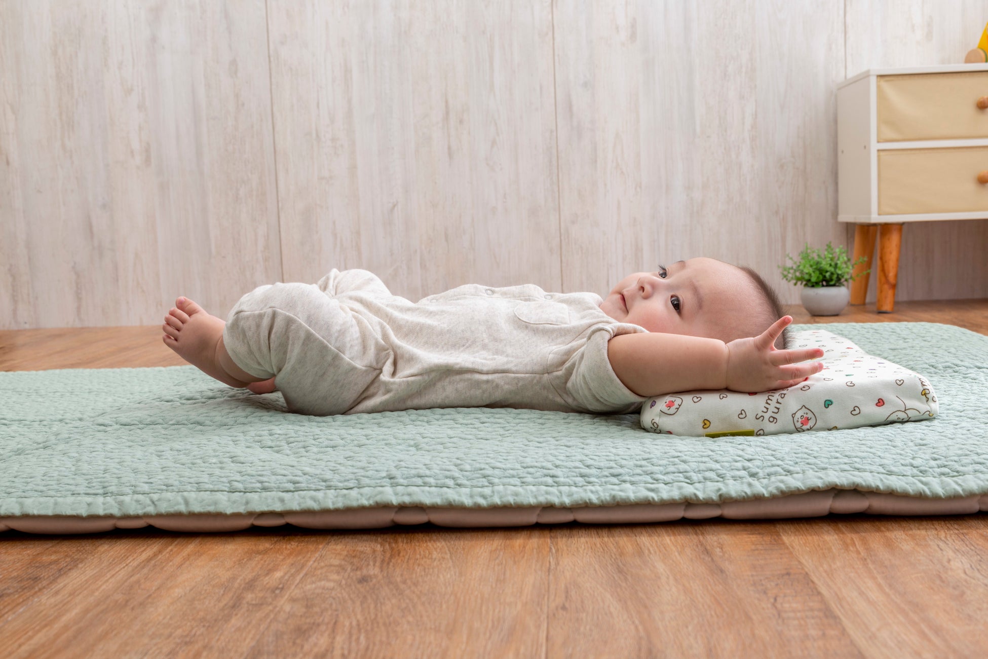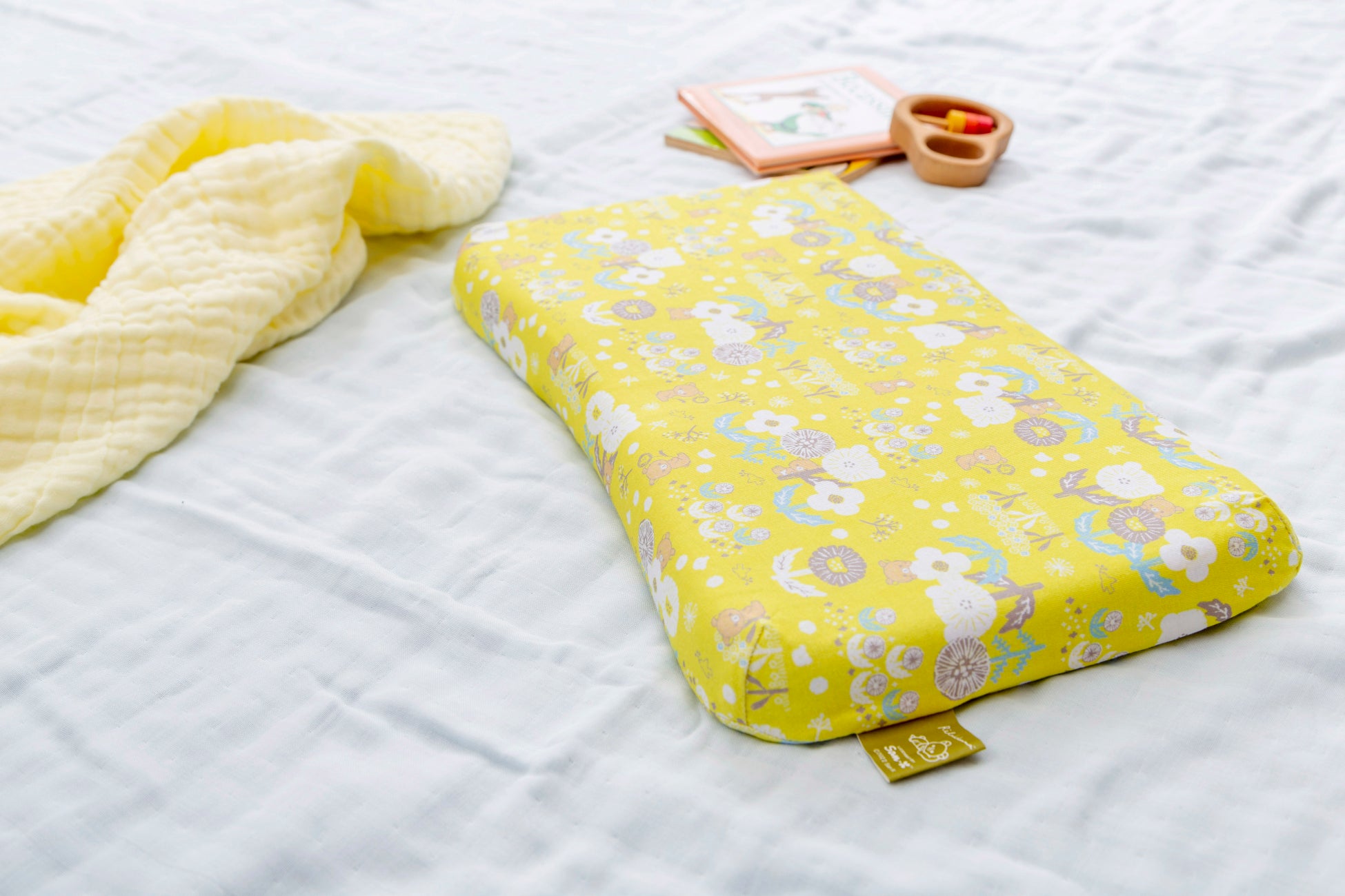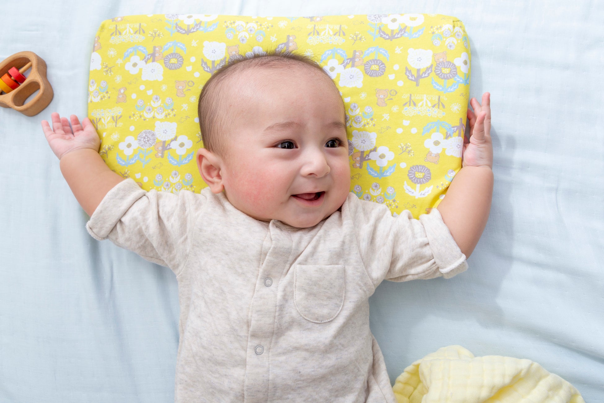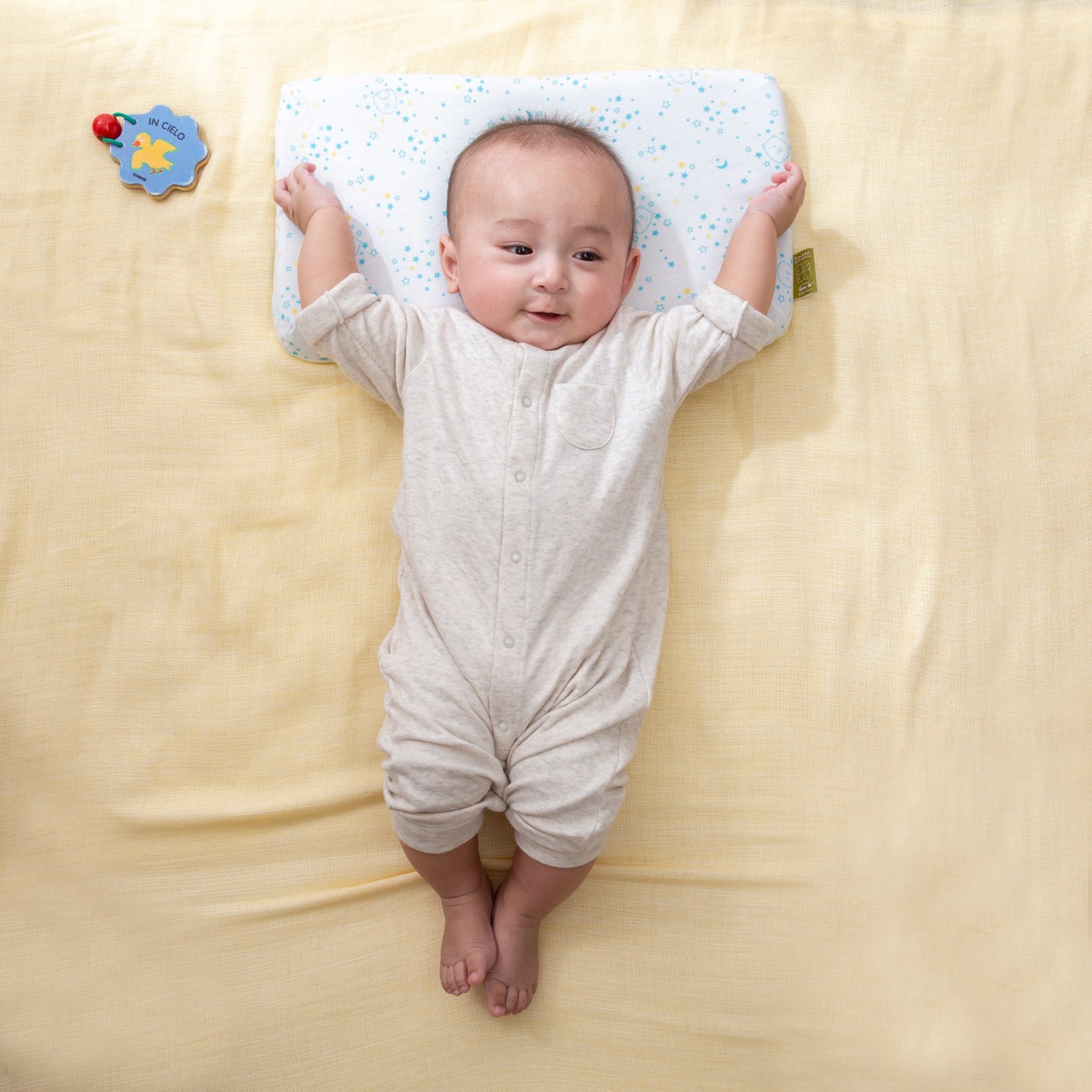 1.人間工学に基づいた形状で、赤ちゃんの首・頸椎をやさしくサポート。中央の丸いくぼみは、360°丸い曲面で赤ちゃんの頭にやさしく包み込むようにフィットし、絶壁や向き癖を防止します。赤ちゃんが動いても枕から落ちてしまわないよう、枕自体もずれにくく安定するように、横幅は大きめに設計しました。