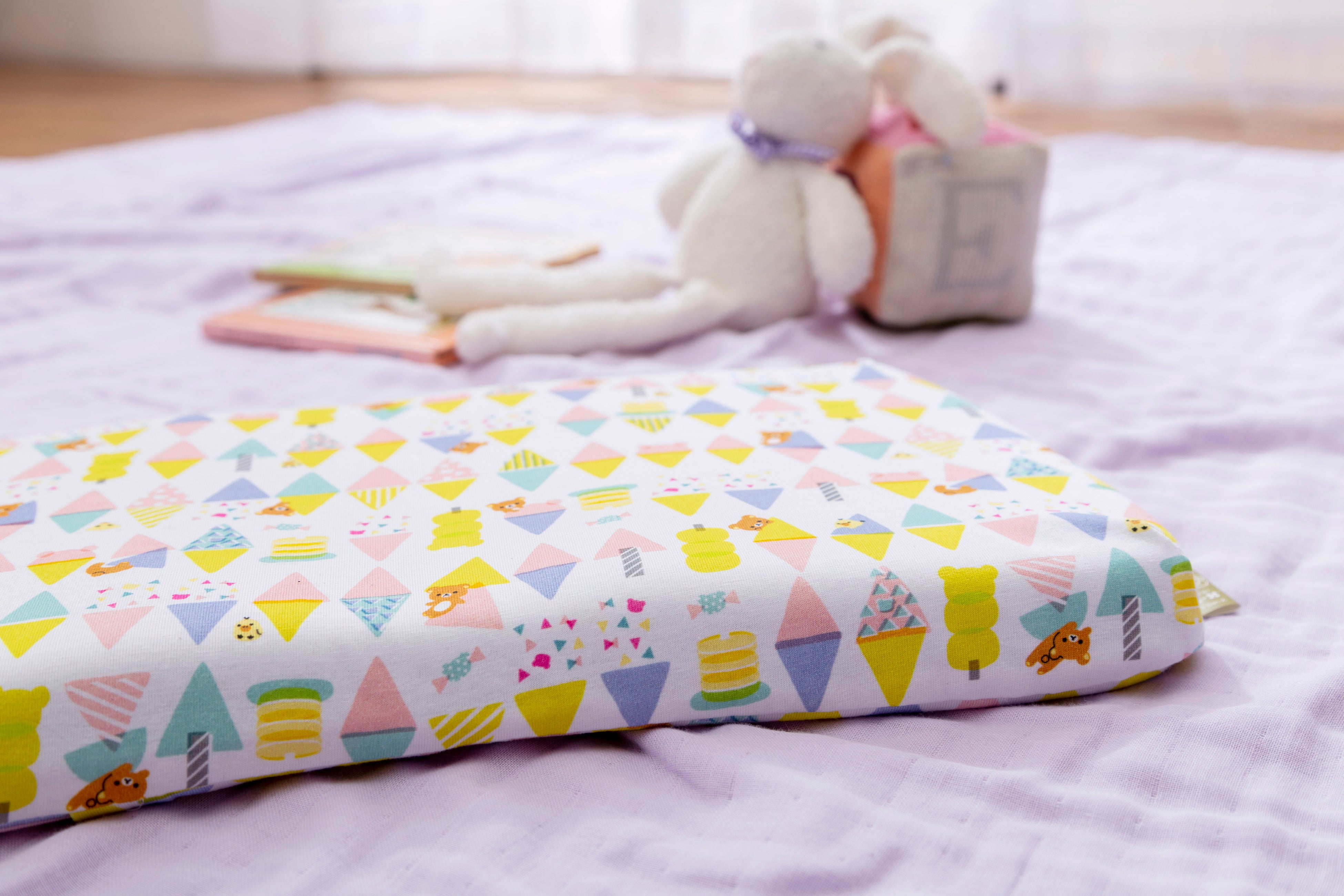 3.赤ちゃんの肌が直接触れるカバーには、柔らかい肌触りにこだわったオーガニックコットン100%を使用。リラックマ、すみっコぐらし、それぞれにかわいい柄カバーが2枚セットで付属するので、洗い替えにも便利です。