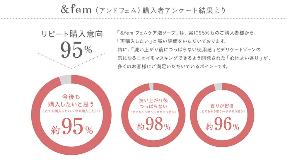 &femフェムケア泡ソープは、購入者アンケートにて95%以上の方から「リピートしたい」という評価をいただいており、「使い続けやすい詰替タイプが欲しい」という声にお応えし詰替え品も誕生しました。