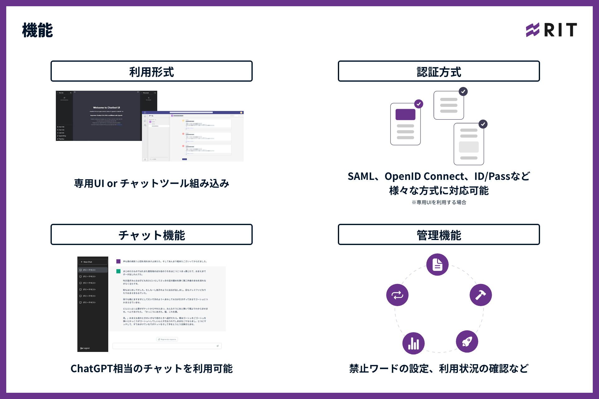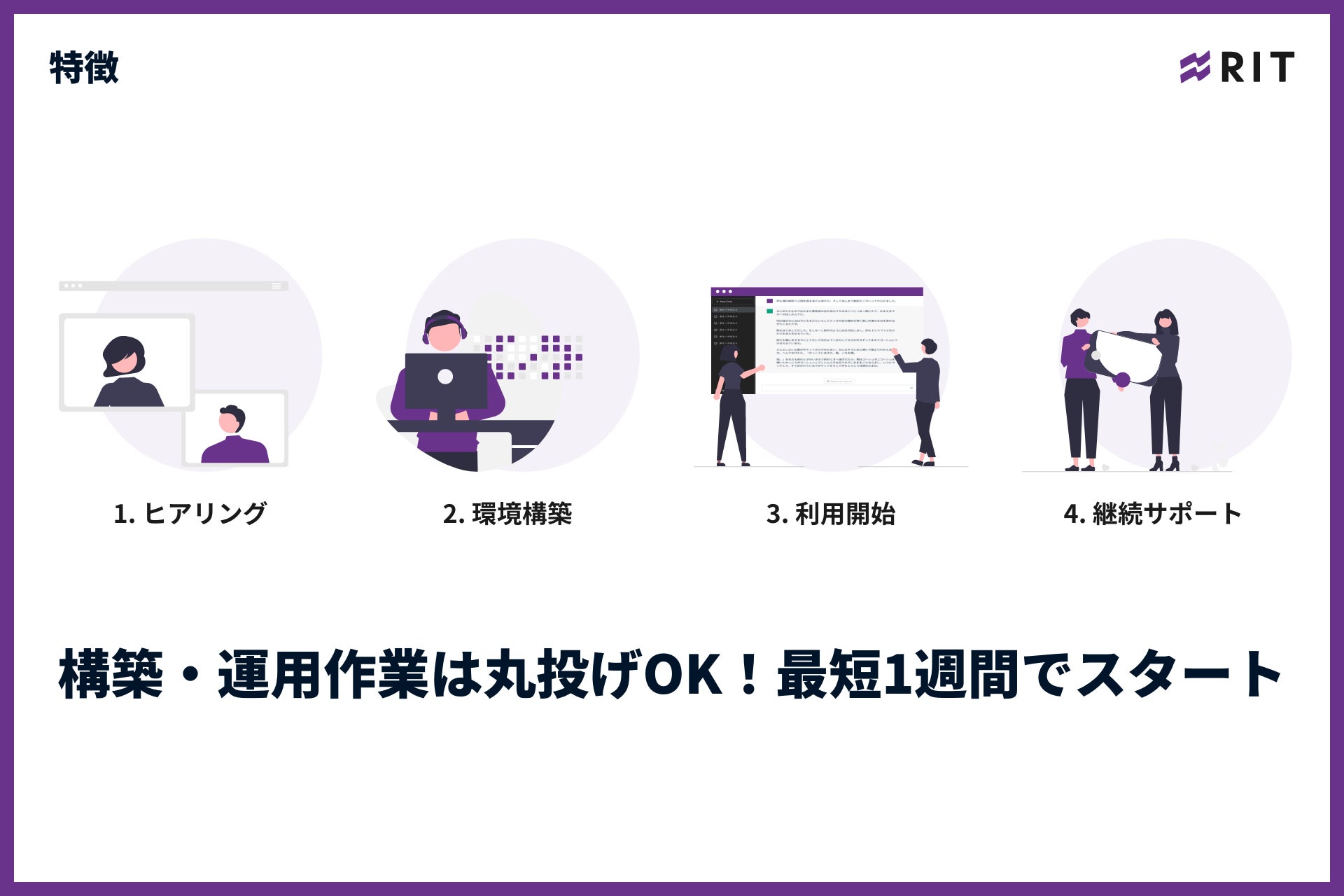 迅速な開始: RITが環境の準備を行い、最短1週間でスタートできます。お客様はChatGPT相当の専用のUIを使用します。