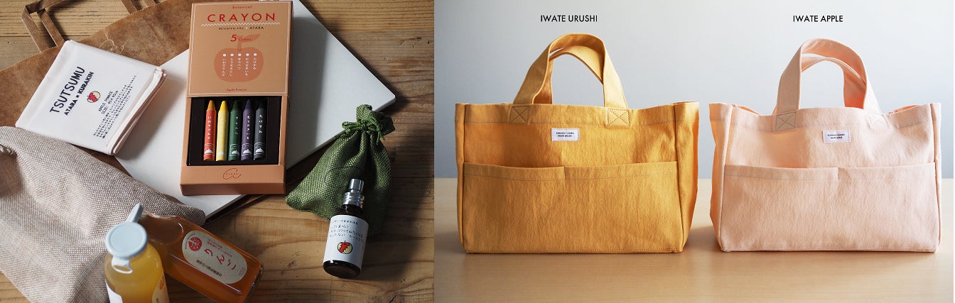 果実の搾りかす、摘花由来の香気成分を含んだ水分を活用したルームスプレーや、果実の搾りかすや漆の伐採木チップ等の地域の未活用・低価値な資源を原料に染色した「のこり染め」のトートバッグとポーチなど資源を余すことなく活用した商品がお披露目される。