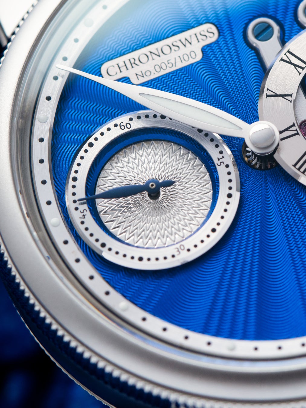 文字盤は、ルツェルンのアトリエでハンドギョーシェ彫りが施され、ガルバニック仕上げで、深みと個性が引き出されています。9時位置にある光沢のある白いラッカー仕上げのスモールセコンドは、美しいコントラストを生み出し正確な時を刻みます。