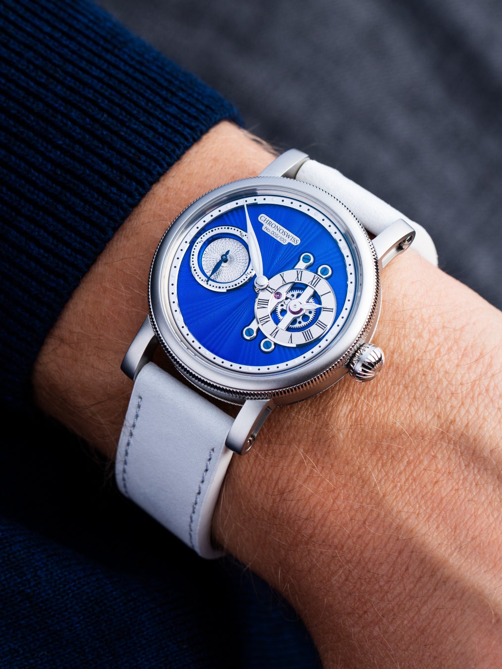 「ストライク・ツー ステラブルー」の特徴は、鮮やかなカラー文字盤とクロノスイスの職人技が光るハンドギョーシェ彫りです。深みのあるブルーのメインダイヤルは、CVDコーティングとハンドギョーシェ彫りが施され、独特の彫り込みが、宇宙を駆け抜ける光の軌跡を思わせます。この直線的なテクスチャーは、単なる美しさだけでなく、まるで重力に引かれた星の光のように文字盤全体へと視線を誘います。水平に配置されたレギュレーターレイアウトの9時位置のスモールセコンドにもハンドギョーシェ彫りが施されています。直径40mmのマット仕上げのステンレススチール製ケースに収められた「ステラブルー」は、深みのある色とシルエットで、軽やかで未来的な雰囲気を醸し出します。