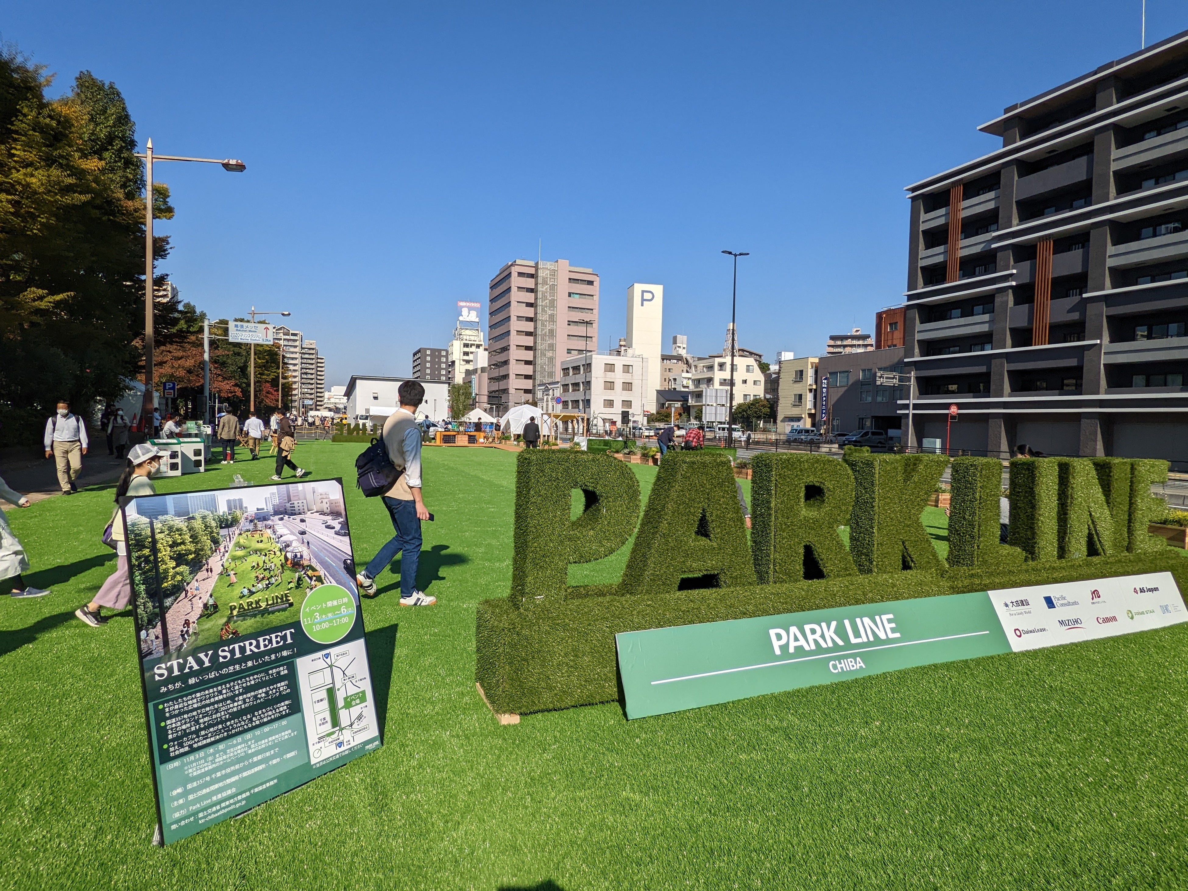 Park Line推進協議会が取り組む今回の社会実証テーマ:“STAY STREET ~Well-Being CHIBA ”今回の社会実証では、横浜での実証に続き、エリア内に100%リサイクル可能な人工芝※4の敷設、及び居心地のよいファニチャーを設置。高品質なGreen空間の創造とウェルビーイング(心の豊かさ)に資するアクティビティを提供します。