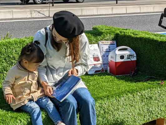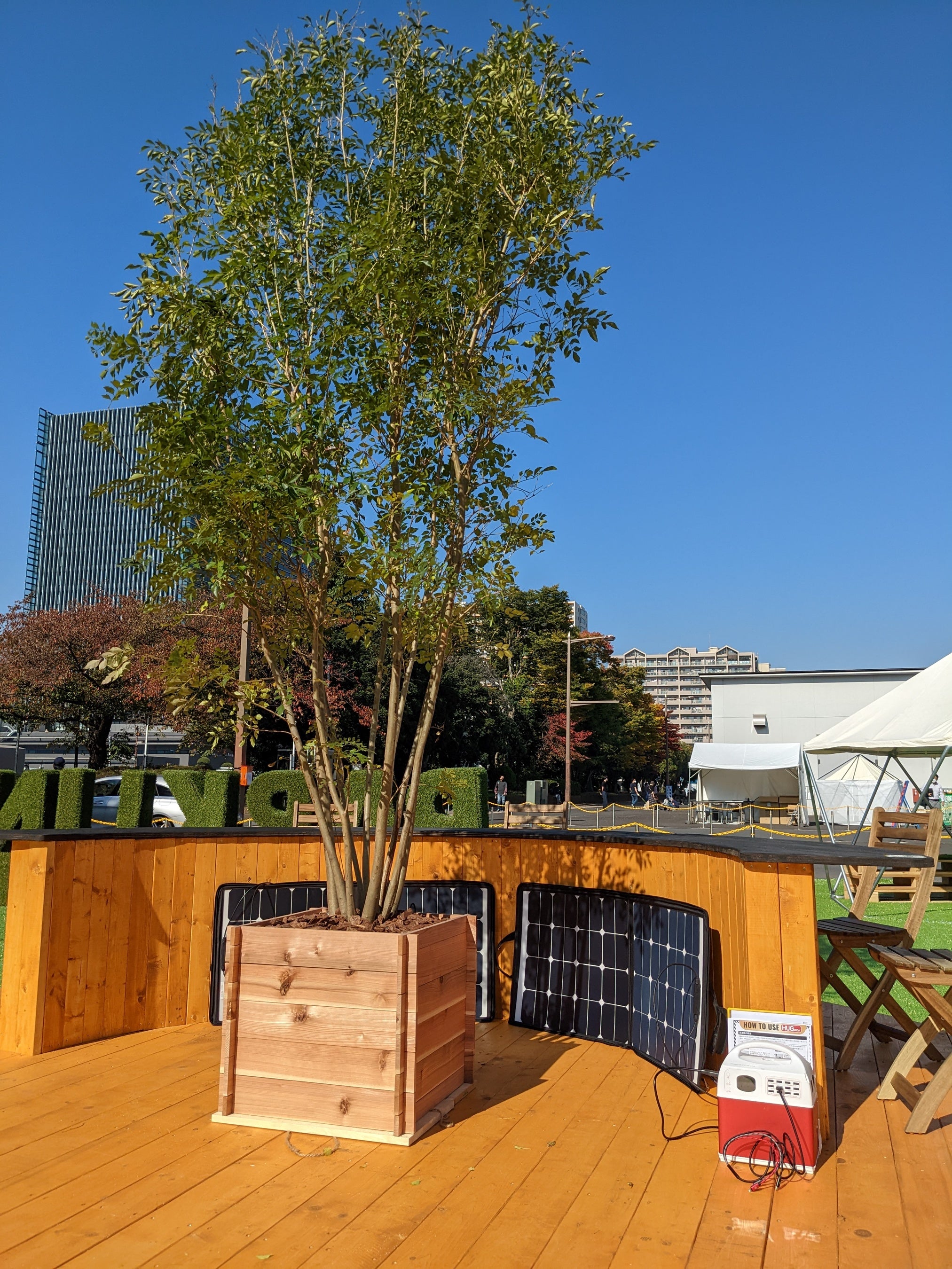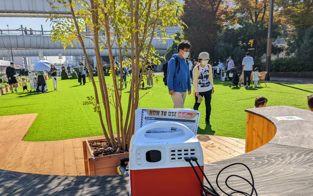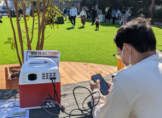 プライム・スター株式会社では、『可搬型リチウムイオン蓄電池・HUGシリーズ』を複数台設置し、小型の太陽光発電パネルと接続しての充電やスマートフォンに対して給電を行います。