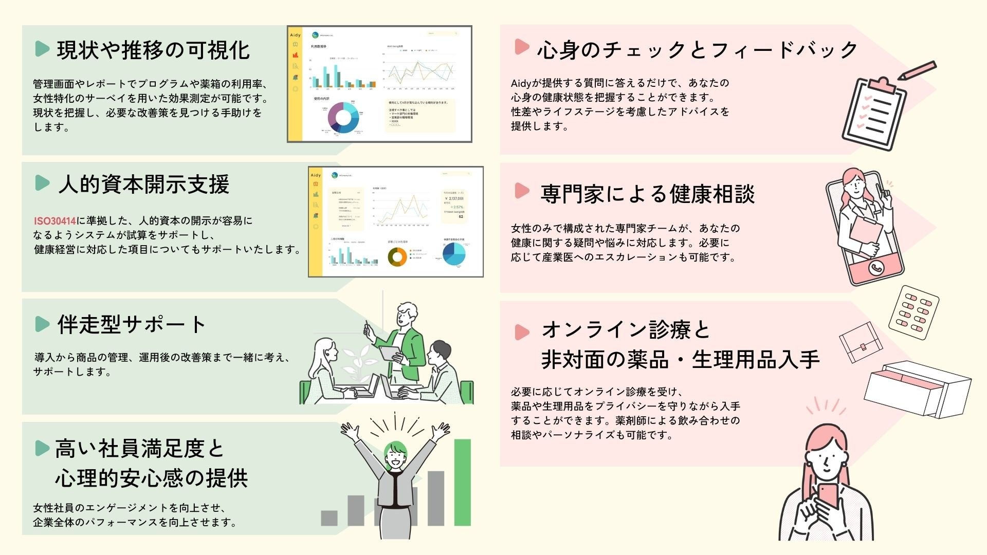 Aidyは女性の健康を包括的に支援するオンラインプラットフォームです。身体的な不調やストレス、不安など女性の悩みに合わせたサービスを提供します。管理画面による現状の可視化から予防、改善迄総合的にご提供でき、OTC薬やオンライン診療など多様なニーズをとらえた幅広いサービスで、女性のライフスタイルやライフステージに合わせた健康管理を実現できます。