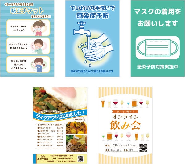 生活のエチケットとなっている、マスク、手洗い、消毒、熱中症対策といった注意書きなどの案内、個人商店向けのテイクアウトや宅配案内などのポップなどを用意しました。
