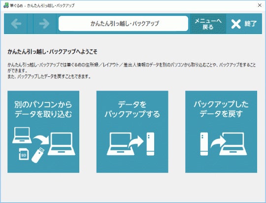 パソコンを買い換えたときなどに、USBメモリを使って住所録や作成したレイアウトの引っ越しが簡単におこなえます。画面の表示にそって進むだけなので迷わずに安心です。