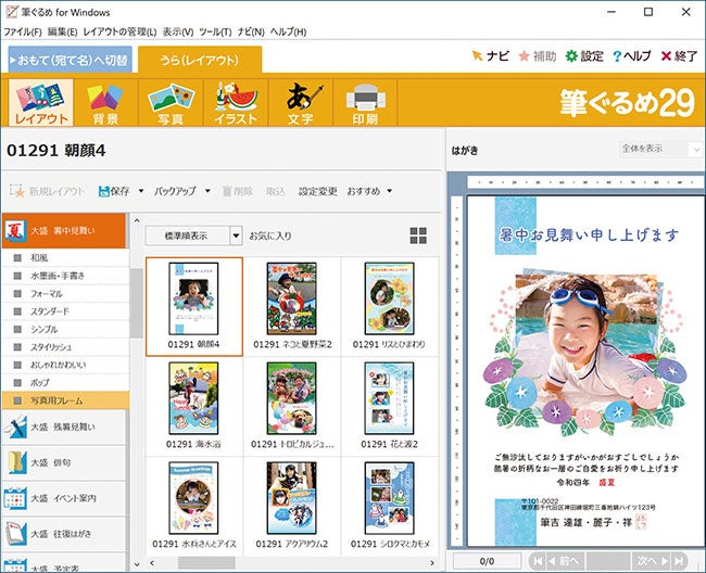 筆ぐるめは、「たのしく・かんたん・きれい」をコンセプトに、パソコン初心者でもかんたんに使えるはがき作成・住所録管理ソフトです。筆ぐるめ 29 大盛は、特典として、様々な場面で利用いただけるイラスト・レイアウトを1,000点、さらに日本語フォント3書体を追加した製品です。暑中見舞いや季節の挨拶状に加え、入学・卒業報告、引っ越しの案内、名前シールや名刺作成の他、小学生向けのスタンプカードや時間割(学校や家庭のスケジュール表)の作成、生活様式の変化による手洗い等のエチケットや個人商店などで使うポップ、様々なシーンでご利用いただけるコンテンツを用意しております。