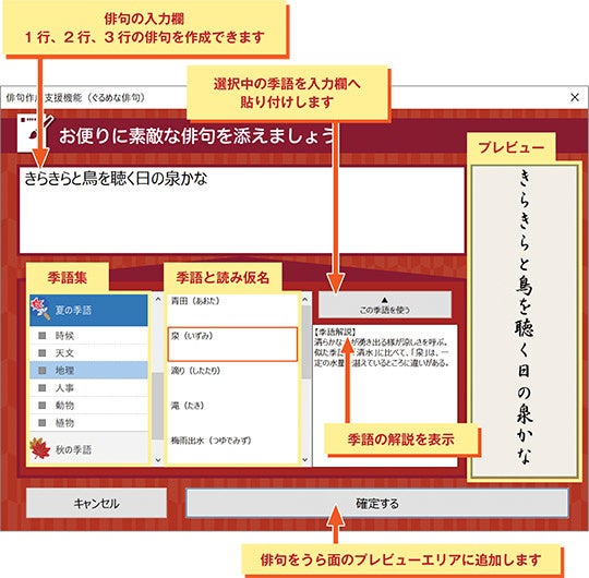 季節のご挨拶などにオリジナルの俳句を添えられるよう俳句作成機能を新たに搭載。俳句を入れるのは面白そうだけど、初めてで不安が残るという方も安心の俳人 夏井いつき先生監修の春夏秋冬・新年の季語を300語を収録。初心者には使いやすく、中級者にも楽しめるように季語の解説も付いてます。