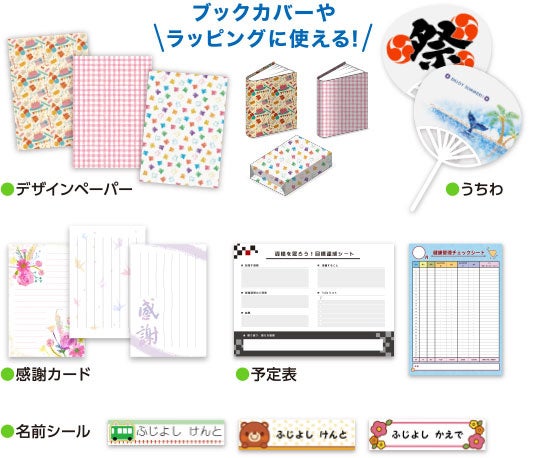 パソコンを使った印刷は、はがき作成だけではありません。色々な用途で使用することができます。デザインペーパーのデザインを印刷し、ラッピングに使用。小学生向けの素材として絵日記、時間割、お名前シール、スタンプカードなど日常で使うグッズのデザインを印刷することができます。また、贈り物や返信の際の一言のありがとうを伝える一筆箋向けのレイアウトデータも用意しました。