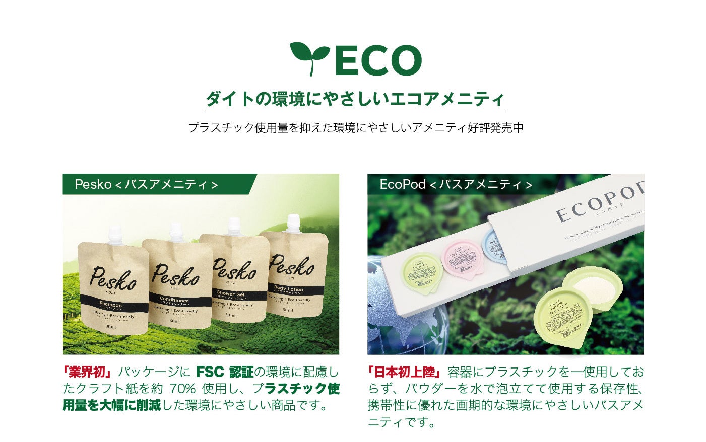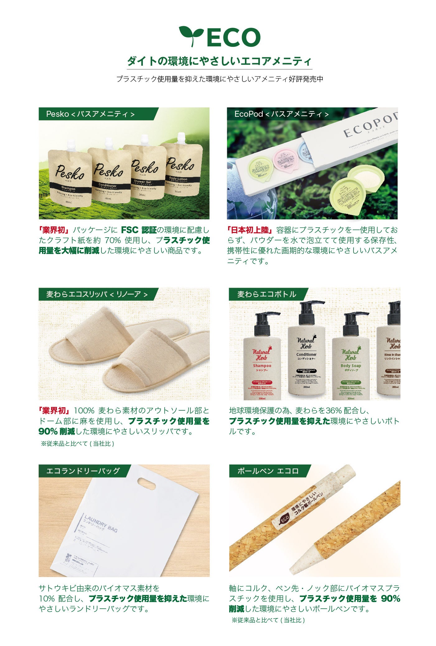 昨今の環境問題に対する意識の高まりと、「プラスチック資源循環促進法」により、アメニティをお客様へ提供されているホテル様や旅館様にとって、ご使用後の廃棄プラスチック削減が悩みの種になっています。