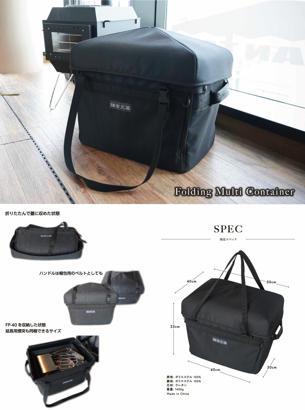 そして特別発注のマルチコンテナボックスは、先日発売となりました1台3役の薪ストーブ「FIRE PIT-40」がピッタリ収まるサイズで、多様な使い方のできる万能なソフトコンテナです。