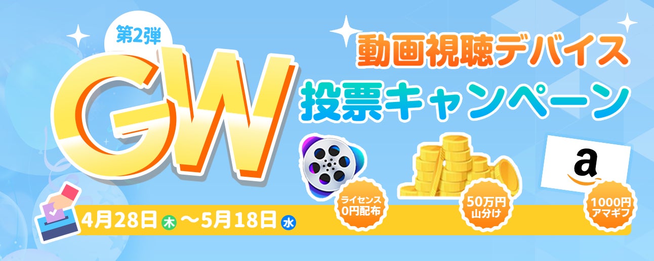 Digiarty Software, Inc.は近日、大好評の第1弾に続き、「GW・最強視聴デバイス投票キャンペーン/第2弾」を開催しております。「最強」の動画視聴デバイスを選ぶと、50万円山分けのチャンスをゲット!全員にもれなく画面録画ソフト「VideoProc Converter」ライセンスも無料配布中~さらに、Twitterへシェア、Amazonギフト券が当たる可能!