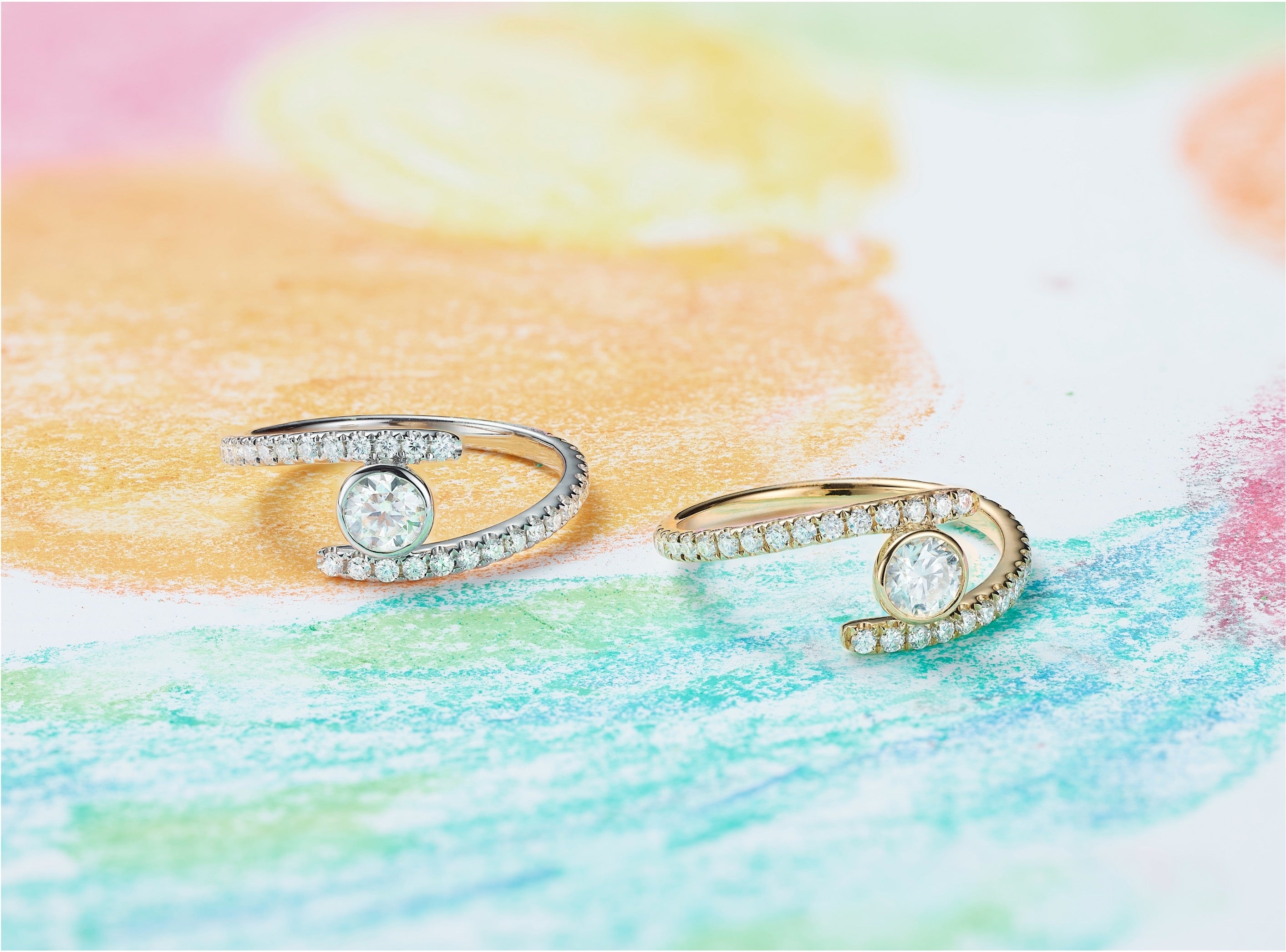 モアサナイトは、隕石の中から発見された鉱物を再現して作られた、ダイヤモンドの2.5倍ともいわれる世界最高峰の輝きと高い耐久性を兼ね備えた人工宝石です。ダイヤモンドに非常に似ていながらも、衝撃への強さ(靭性)、曇りにくさ(低親油性)などにおいてはより優れた性質を持っています。さらに宝飾の世界が持つ諸問題から放たれたエシカルジュエリーであることも評価され 、アメリカでは婚約指輪として選ばれることも増えている新世代のジェムストーンです。