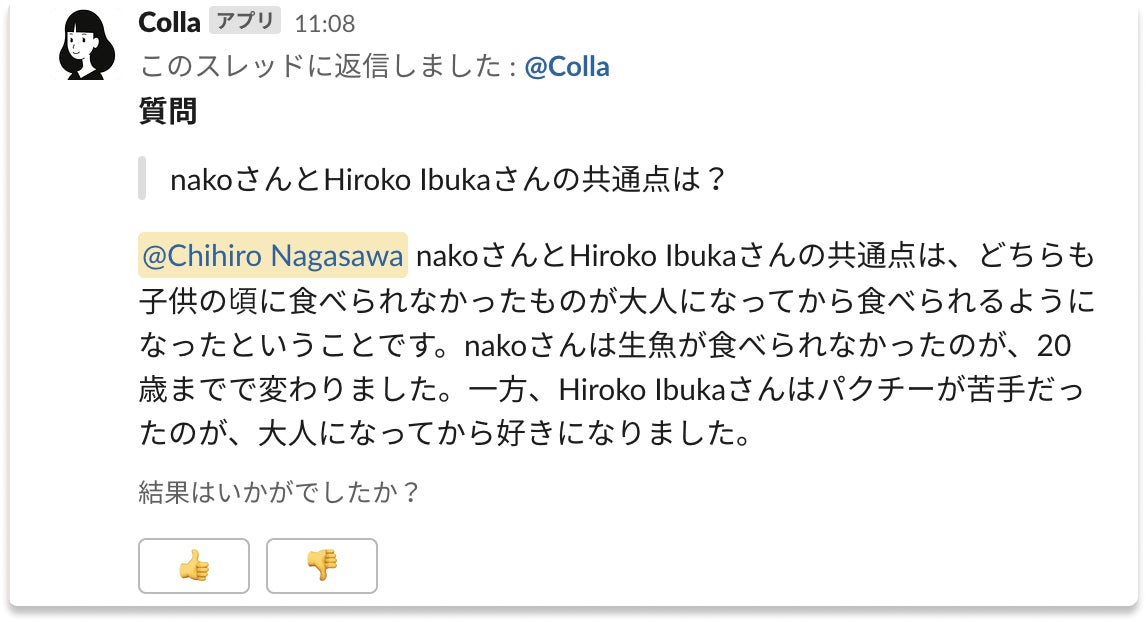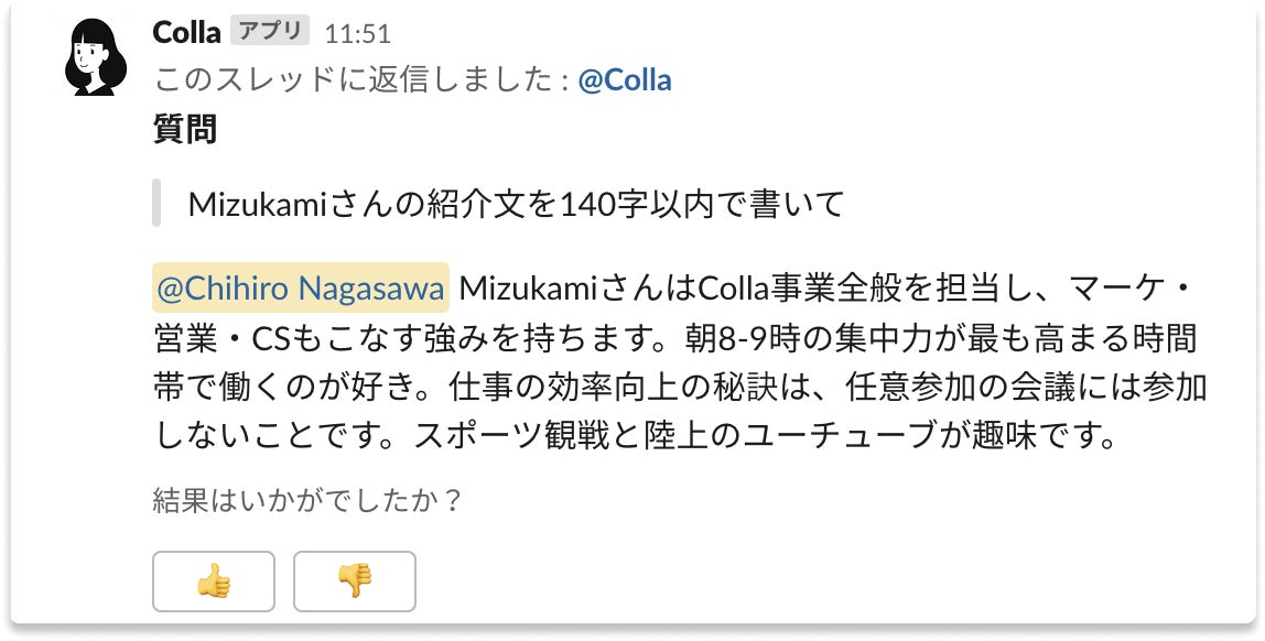 Slackアプリ「Colla」が生成AI対話機能を導入、他の社員について教えてくれる対話可能なAIチームアシスタントbotに進化