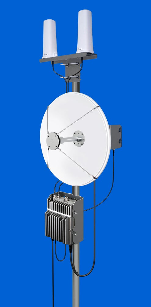 IC-905は144~5600MHzをDV/DD/ATVを含むオールモードでカバーする、業界初※2のトランシーバーです。さらに、CX-10Gを使用(IC-905はオプション/IC-905XGは標準付属)することで、10GHzでも運用可能です。最大出力は、144/430/1200MHzが10W、2400/5600MHzは2W、10GHzは0.5Wを実現しています。最大の特長は、RFユニットをコントローラーと分離し、アンテナ直下におくことを可能にしていること。これにより、高い周波数帯で大きな問題となる同軸ケーブルの損失を大幅に低減しています。しかも、このコントローラーケーブルで電力を供給することが可能。接続が1本のケーブルで済むため、RFユニットの設置の自由度は大幅に高まります。