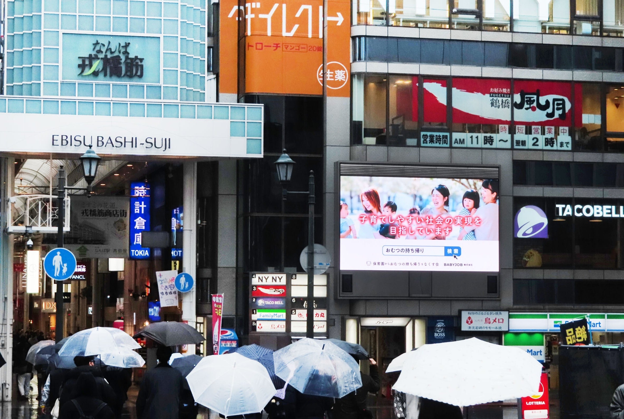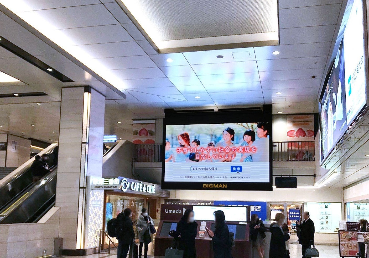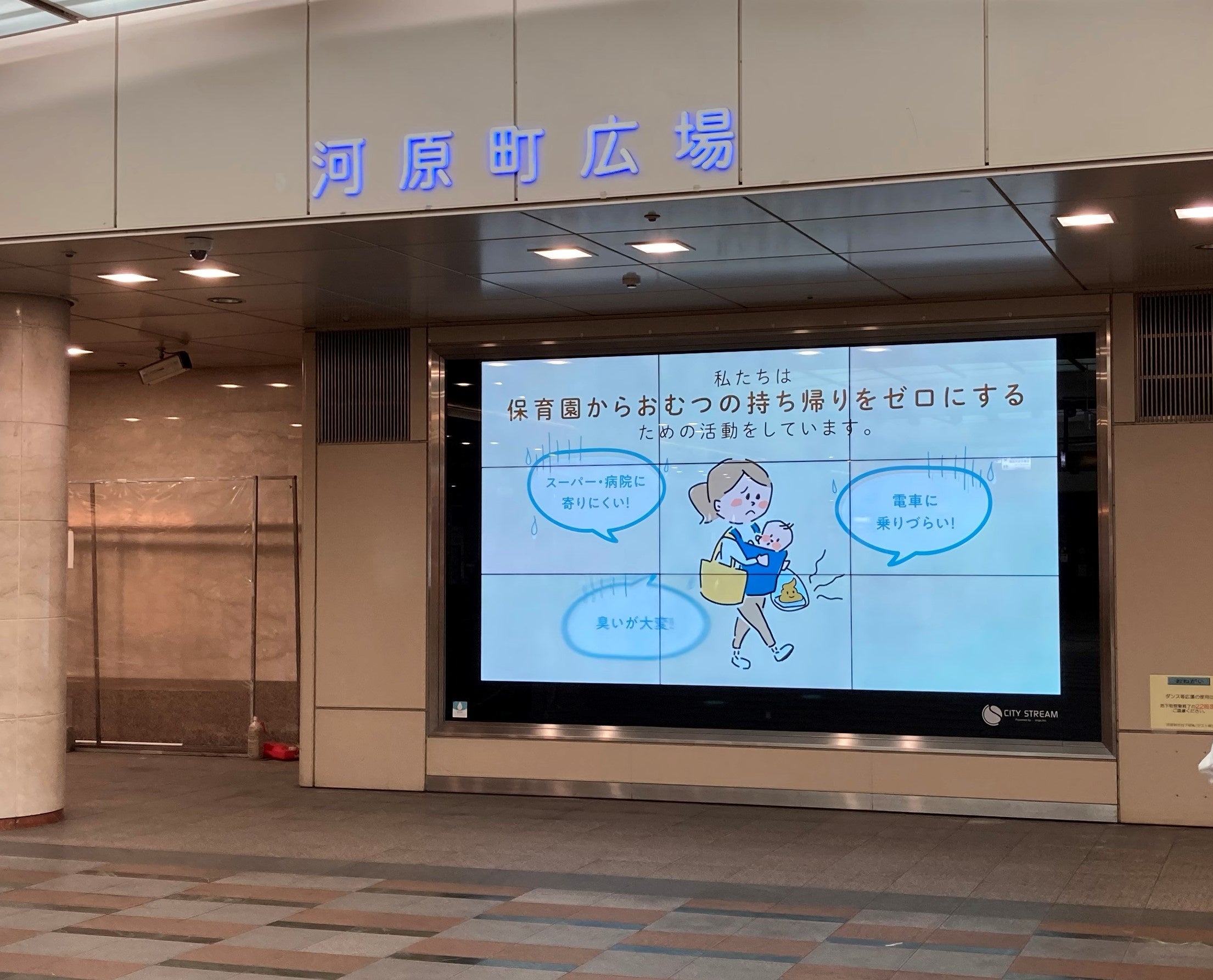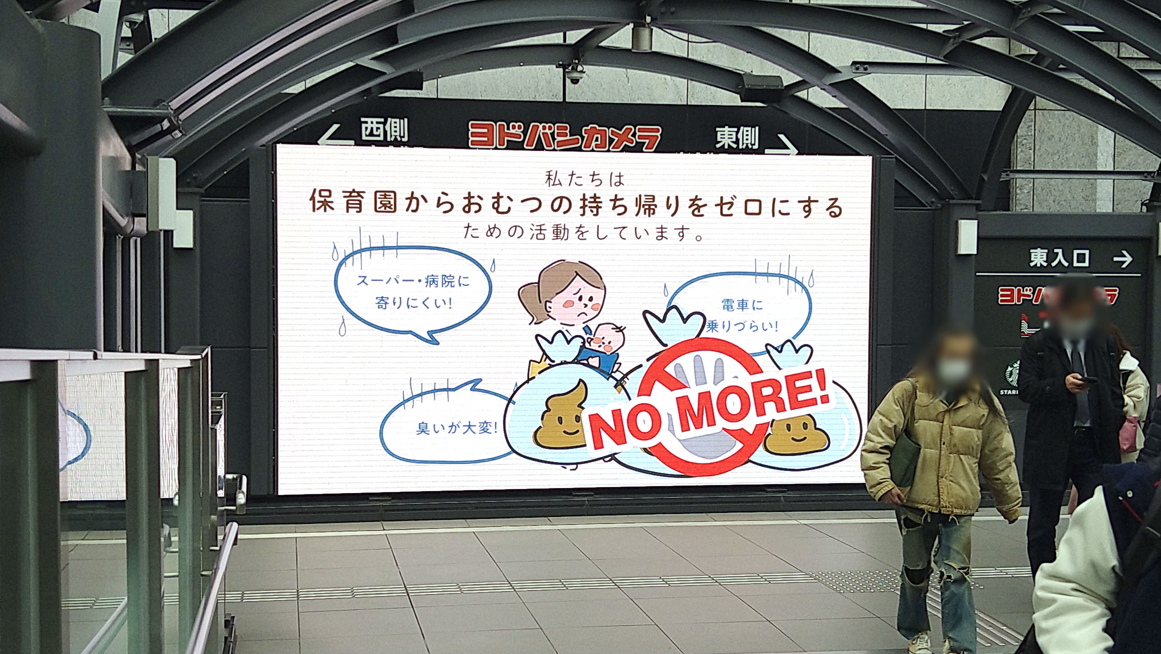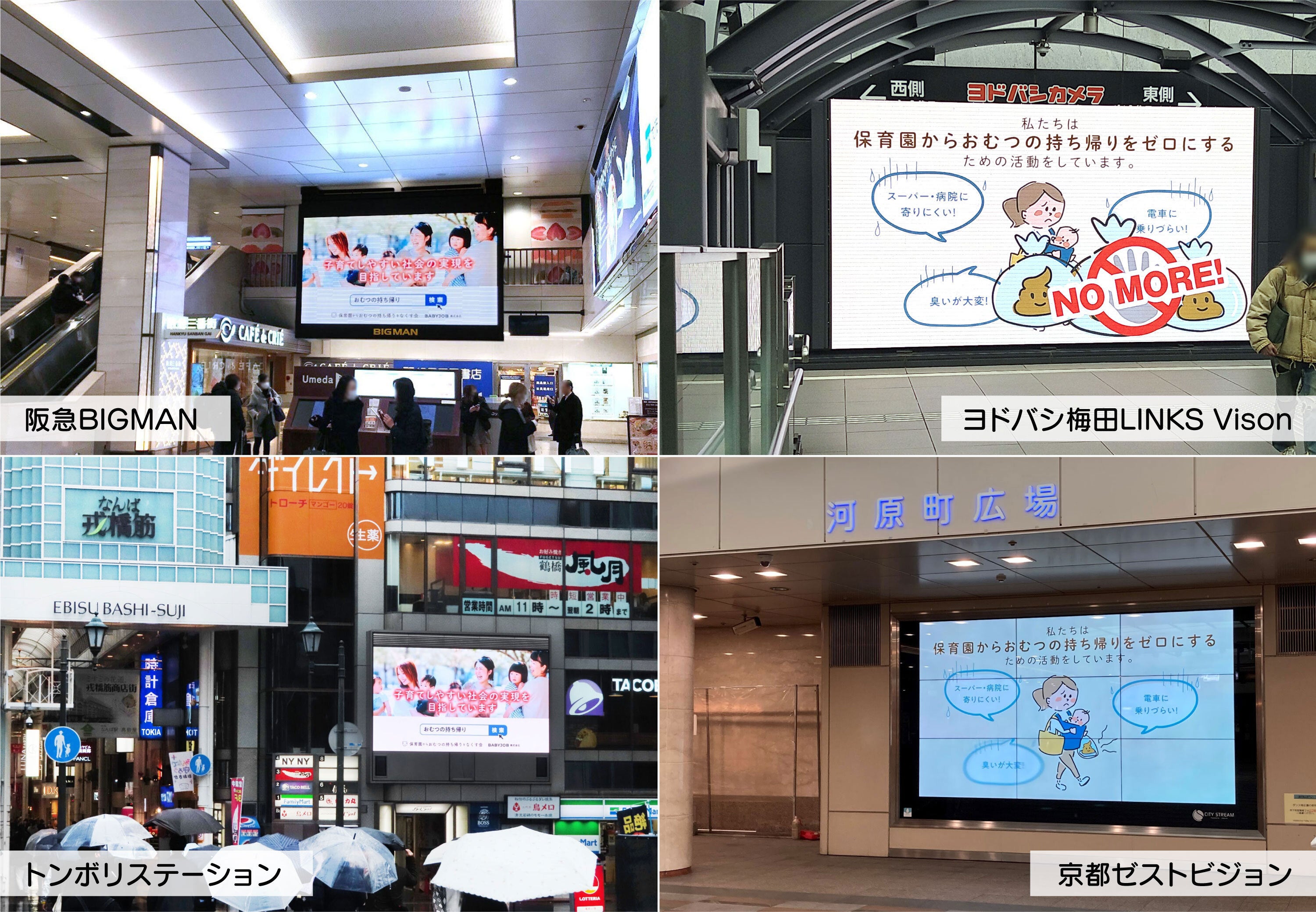 おむつの持ち帰り率が高い関西地域で多くの方に問題意識を持っていただくために、大阪府・京都府の大型ビジョン(阪急BIGMAN、ヨドバシ梅田LINKS Vision、トンボリステーション、京都ゼストビジョン)で広告配信を行いました。