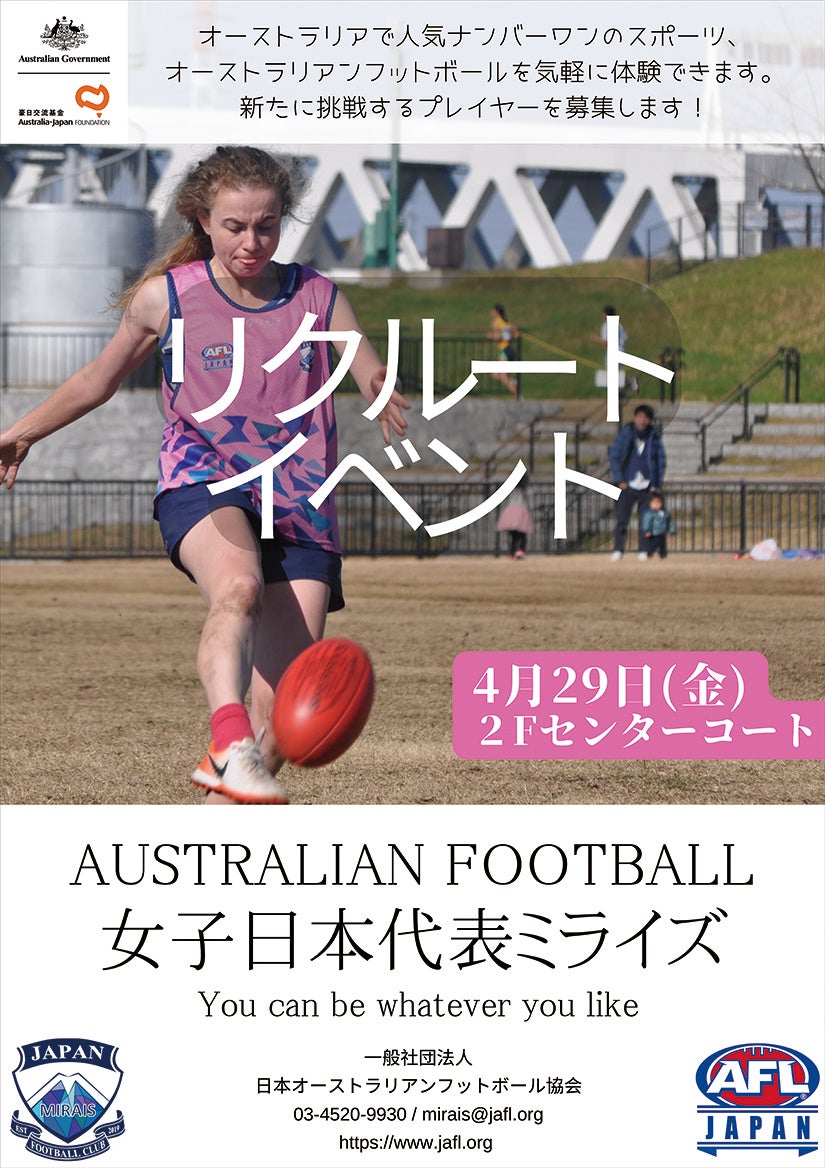 当日は女子日本代表チームMiraisの監督やプレイヤーも会場でオーストラリアンフットボールをご紹介する予定です。多くの皆様のご来場をお待ちしております。