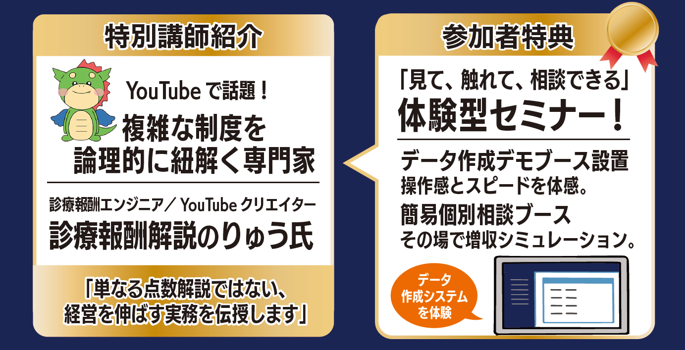 本セミナーでは、YouTube「診療報酬りゅうチャンネル」でも話題を集める診療報酬エンジニア・りゅう氏を特別講師にお招きし、複雑な制度を論理的に紐解き、単なる点数解説に留まらない「経営を伸ばす実務」を伝授いたします。さらに、ITやシステム設定が苦手な方でも「ワンクリック」でデータ作成を完了させ、事務負担をゼロにするソリューションもご紹介します。5月の申請締切に間に合わせるためのラストチャンスとなる必聴のセミナーです。