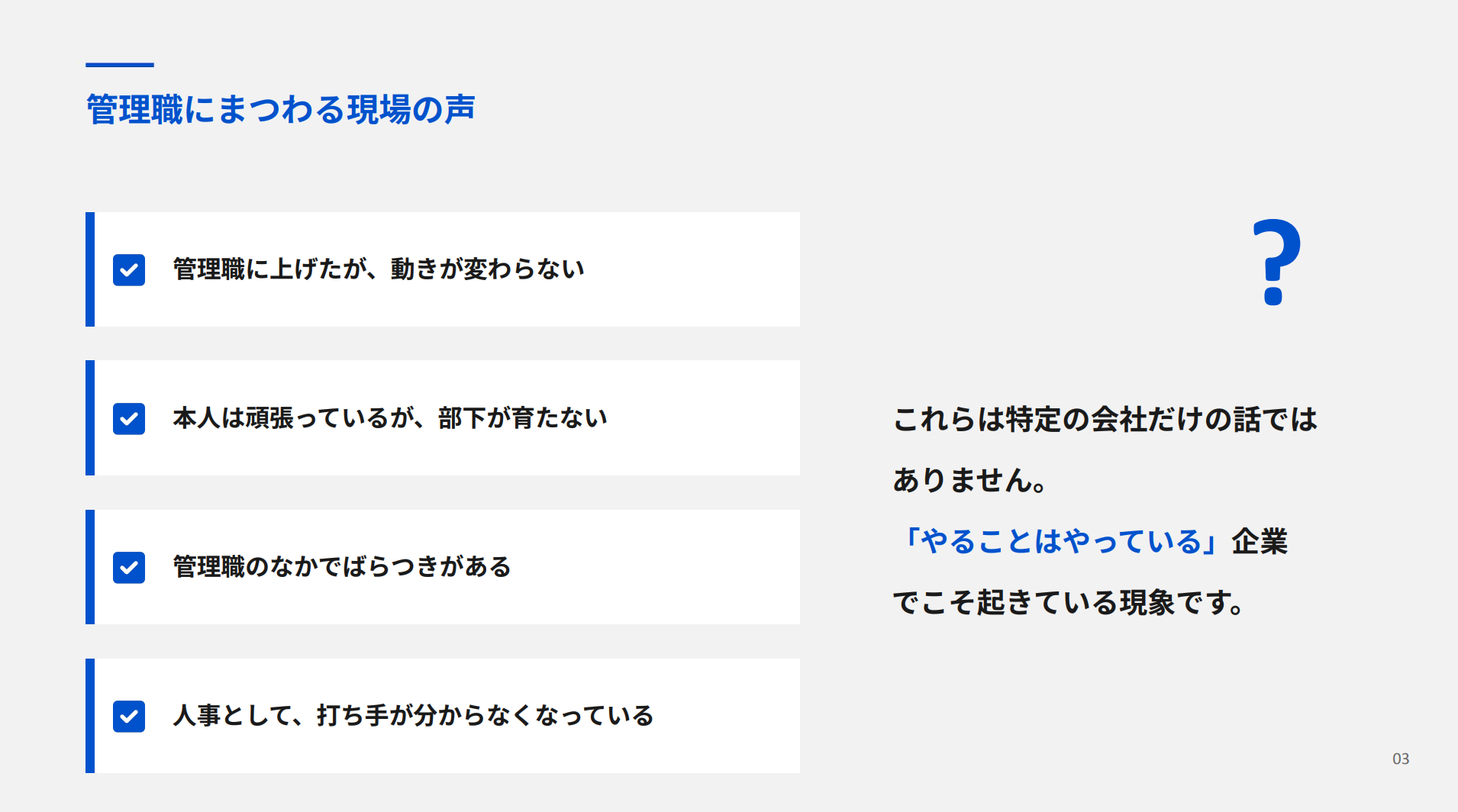 本資料では、管理職育成にばらつきが生じる根本原因を2つに整理しています。