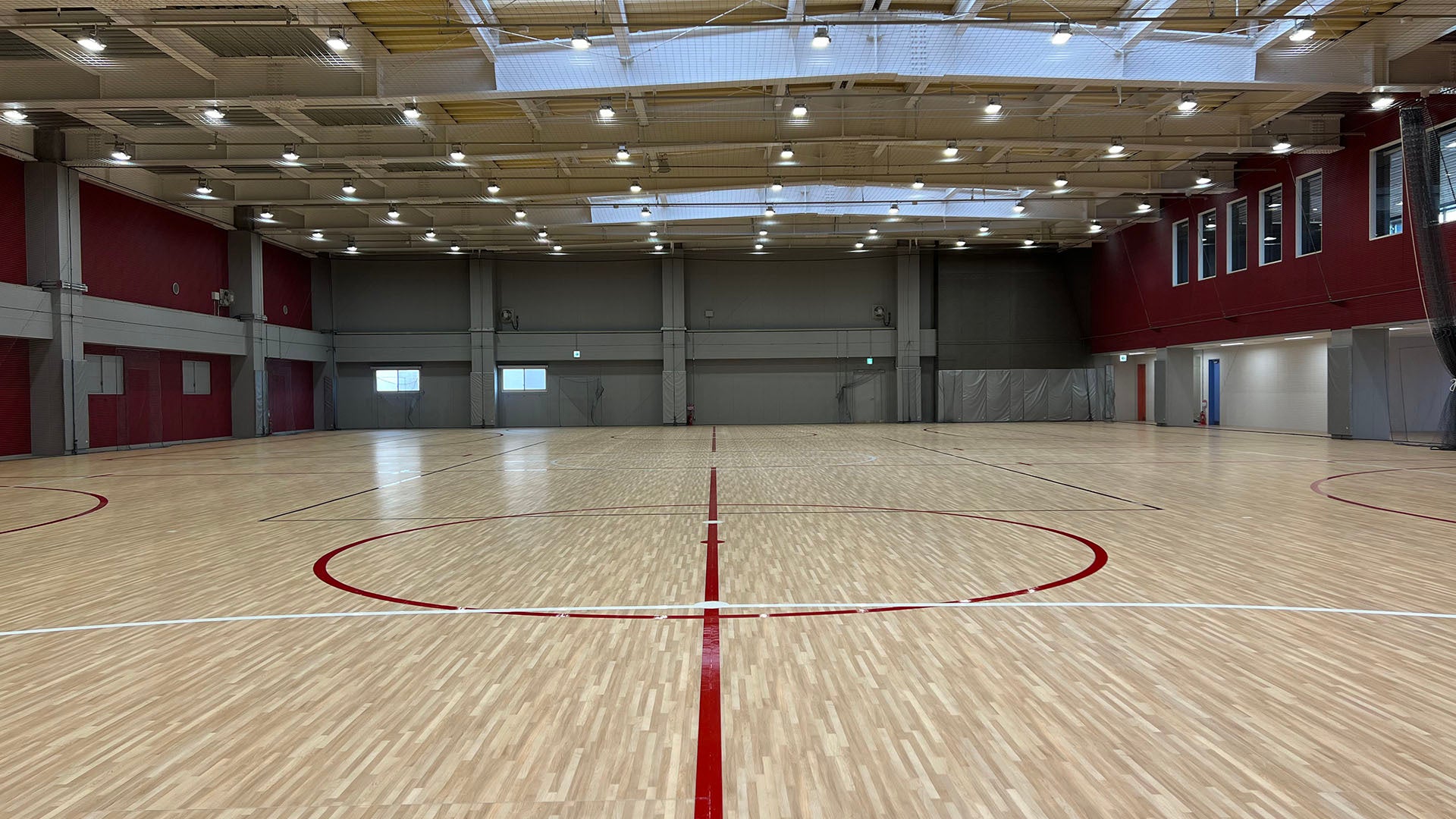 新コートでは、スポーツフロア専用の二重床下地システムと高弾性衝撃吸収シート床材(レックスコート)を採用。均一でムラのない床弾性が得られると同時に、着地時は膝の負担が少なく、着地後は反発力が大きく飛び跳ねやすく運動のし易さに特化した床システムです。